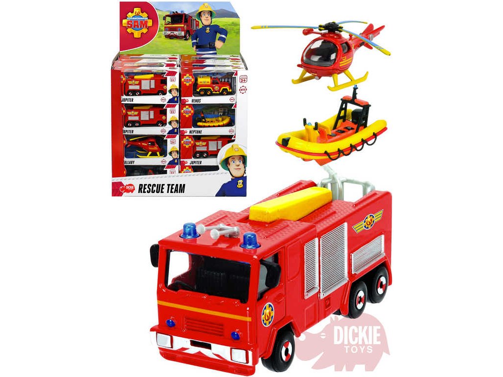 Krásné záchranářské kovové autíčko (vrtulník, člun) na volný chod v licenci Požárník Sam, v různých variantách provedení. Baleno v krabičce.