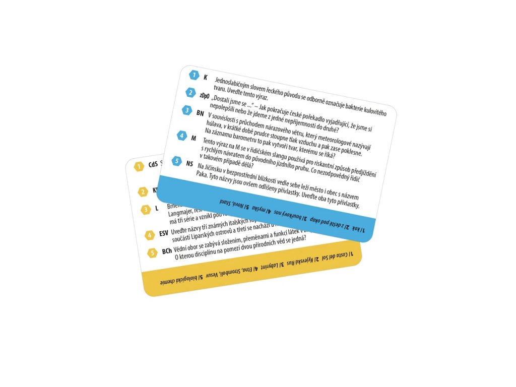 AZ kvíz na cesty je oblíbená vědomostní hra inspirovaná populární televizní soutěží, nyní v praktickém cestovním balení. Můžete si tak otestovat své znalosti kdekoliv – na dovolené, ve vlaku nebo třeba na chatě. Hra obsahuje 600 zcela nových otázek, které zaručí ještě zábavnější zážitek.Hrát ji můžete samostatně, nebo použít kartičky jako rozšíření k velké verzi hry AZ kvíz. Hra je určena pro hráče od 13 let, takže je ideální volbou pro teenagery i dospělé, kteří si chtějí poměřit své vědomosti. Balení obsahuje: 60 oboustranných karet – 600 nových otázek70 záznamových tabulek s herním plánem1 bodovou hrací kostku Hlavní vlastnosti: cestovní hratrénuje paměťvyrobeno v ČR