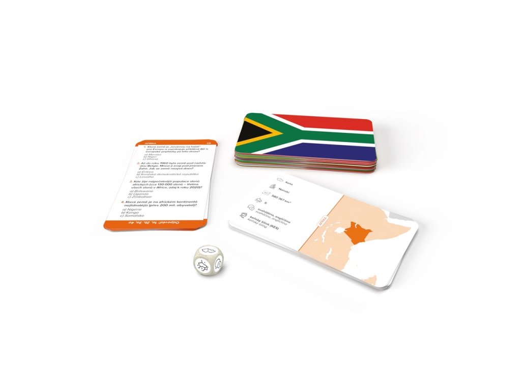 Vědomostní karetní hra, která procvičí znalosti vlajek a základních informací o státech Afriky. Poznáte vlajky všech 54 afrických států? Určíte, které zemi patří vlajka, jaké má hlavní město, úřední jazyk, měnu, sousední státy nebo rozlohu? Hra obsahuje i sadu kvízových otázek o zajímavostech afrických států. Kdo první správně odpoví, získává kartu. Změřte síly v této naučné zábavné hře. Hru lze hrát samostatně nebo propojit se státy dalších světadílů z této edice. Obsah balení: 70 karet1 kostka se symbolypravidla Hlavní vlastnosti: zábavná vědomostní hramožnost rozšíření pomocí dalších verzí z této edicekompaktní rozměryvhodné i na cestyvyrobeno v ČR Zkrácený návod ke hřeDoprostřed stolu položte promíchaný balíček karet vlajkami nahoru. Hráč, který je na tahu, hodí kostkou. Symbol na kostce určí, na na kterou otázku z karty se bude odpovídat. Hráči hrají všichni současně. Kdo odpoví nejrychleji a správně, kartu získává. Hra končí, když dojde balíček karet a vyhrává ten, kdo jich získal nejvíce.