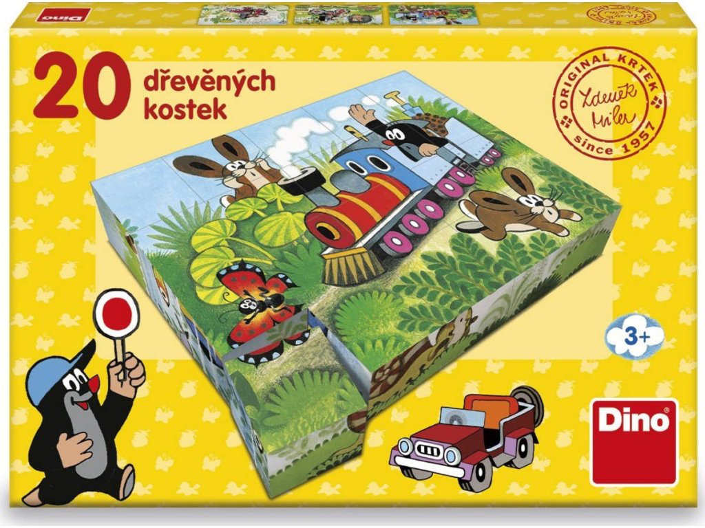 Dřevěné obrázkové kostky, kubus Dino z kvalitního dřeva s motivem Krtek a doprava. Vyrobeno v Česku. 20 kostek v krabici.