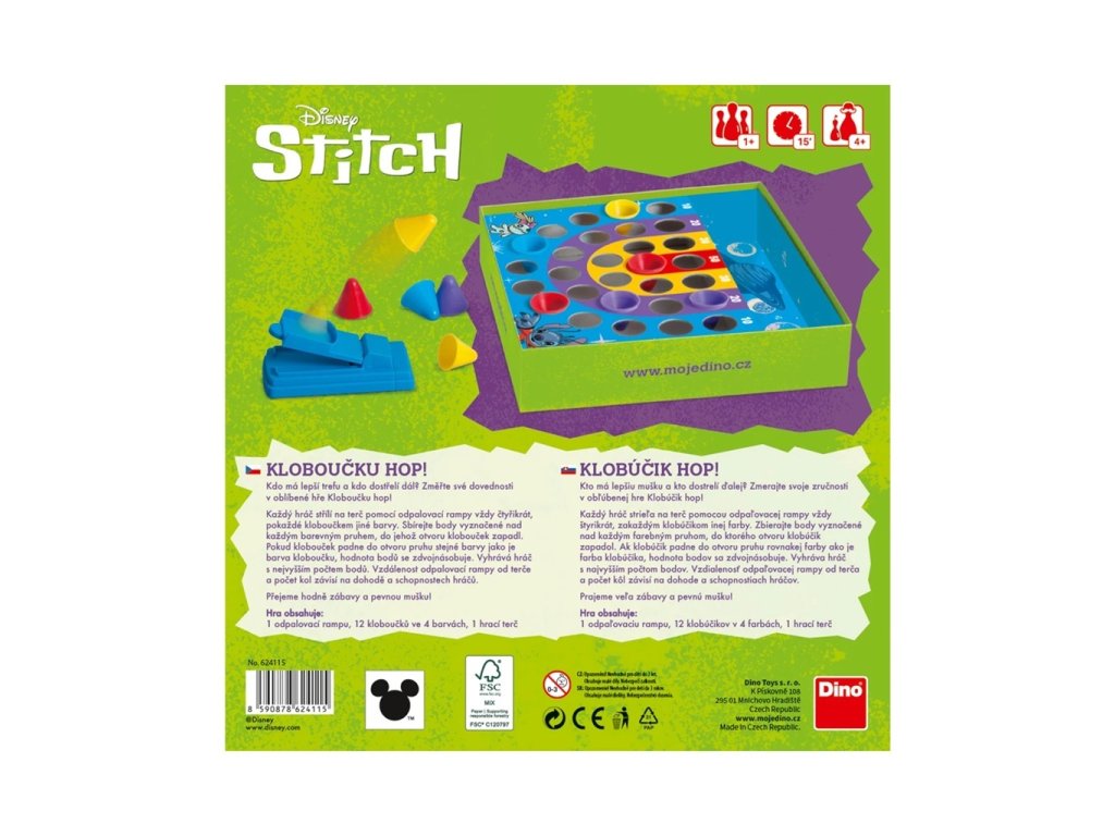 Oblíbená hra Kloboučku hop tentokrát v designu populární licence Stitch. Kdo lépe míří a kdo dostřelí dál? Bavte se a změřte své dovednosti v oblíbené hře našeho dětství. Každý hráč střílí na terč pomocí odpalovací rampy vždy čtyřikrát, pokaždé kloboučkem jiné barvy. Sbírejte body vyznačené nad každým barevným pruhem, do jehož otvoru klobouček zapadl. Pokud klobouček padne do otvoru pruhu stejné barvy, jako je barva kloboučku, hodnota bodu se zdvojnásobuje. Vyhrává hráč s nejvyšším počtem bodů. Vzdálenost odpalovací rampy od terče a počet kol závisí na dohodě a schopnostech hráčů. Obsah balení: 1 odpalovací rampa12 kloboučků ve 4 barvách1 hrací terč Hlavní vlastnosti: tradiční hra prověřená generacemitrénuje jemnou motoriku a koordinacivyrobeno v ČR