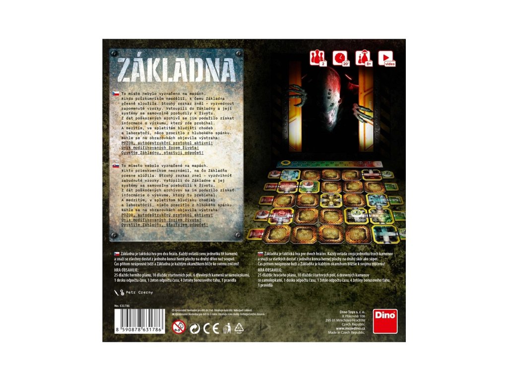 Nechte se strhnout do této originální české autorské hry a přijměte výzvu Základny. Zábava, napětí a taktika Vás čeká na každém kroku. Připravte se na adrenalinový zážitek a staňte se zachráncem všech zapomenutých vzorků! Zapomeňte na bezpečné hraní a vstupte do dobrodružného bludiště chodeb a laboratoří opuštěné Základny. Vyzkoušejte, jak rychle a takticky dokážete přesunout své tři kameny na druhý konec Základny a zachránit je před explozí. Každý Váš tah a rozhodnutí hraje klíčovou roli, a to i v souboji s časem. Čas je totiž Vaším největším nepřítelem, neboť Základna je tikající bomba, která se blíží svému zničení! Balení obsahuje: 25 dlaždic herního plánu10 dlaždic startovních polí6 dřevěných kamenů se samolepkami1 desku odpočtu času1 žeton odpočtu času4 žetony bonusového tahunávod ke hře v českém a slovenském jazyce Hlavní vlastnosti: hra zaručí nejen zábavu, ale i napínavé zážitkyprocvičí paměť, postřeh, trpělivost i logické myšlenívyrobeno v ČRdoba hry 20 minut