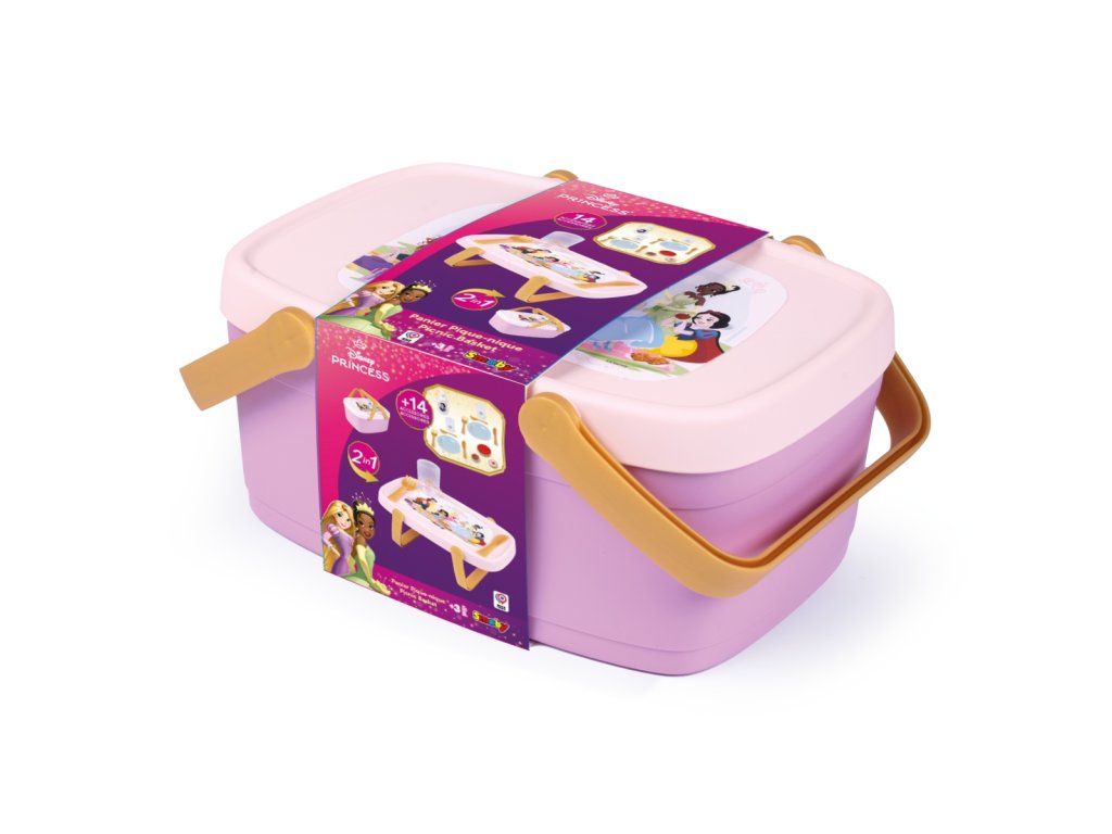 Piknikový koš 2 v 1 s motivem Disney Princess. Chytrý a všestranný piknikový koš se během několika sekund promění v odkládací stolek. Jednoduše sklopte rukojeti a proměňte víko koše v praktický stolek, ideální pro vychutnávání svačinky. Koš obsahuje: 2 talříe, 2 lžíce, 2 nože, 2 vidličky, 2 sklenice, 1 malinový koláč, 2 sušenky, 1 lahev limonády. Vyrobeno ve Francii. Rozměry (DxŠxV): 25,5 x 18 x 11 cm. Vhodné pro děti od 3 let.