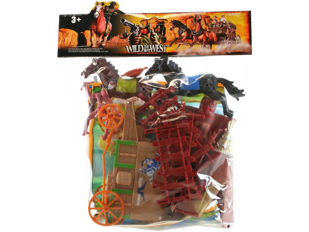 Herní indiánská sada z plastu, obsahující figurku indiána, dostavník, plánek, koně, týpí, totem a další doplňky, v sáčku