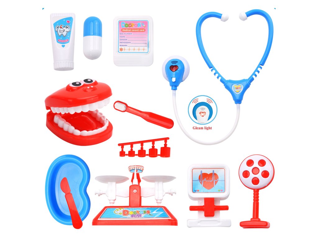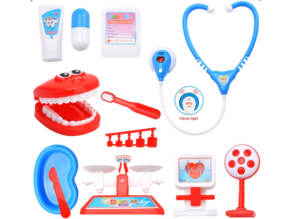 Doktor hrací sada - kufřík se stetoskopem a dalším doktroským vybavením (zubař) Stetoskop baterie: 2 x Ag10 1,5V (součástí balení)