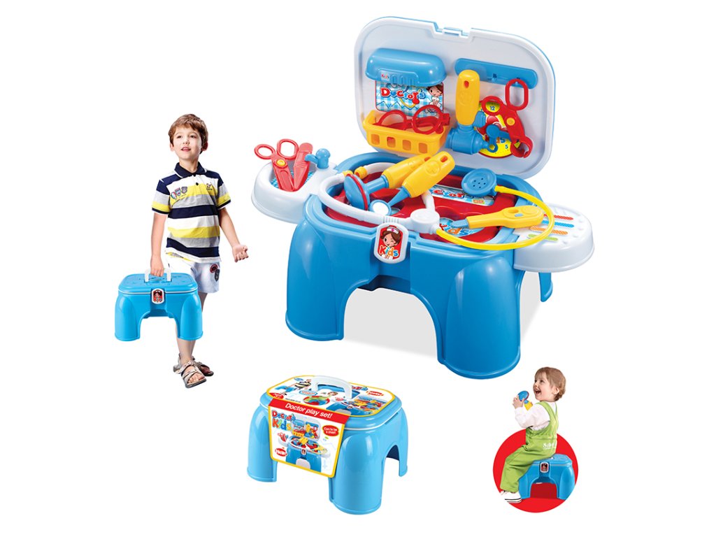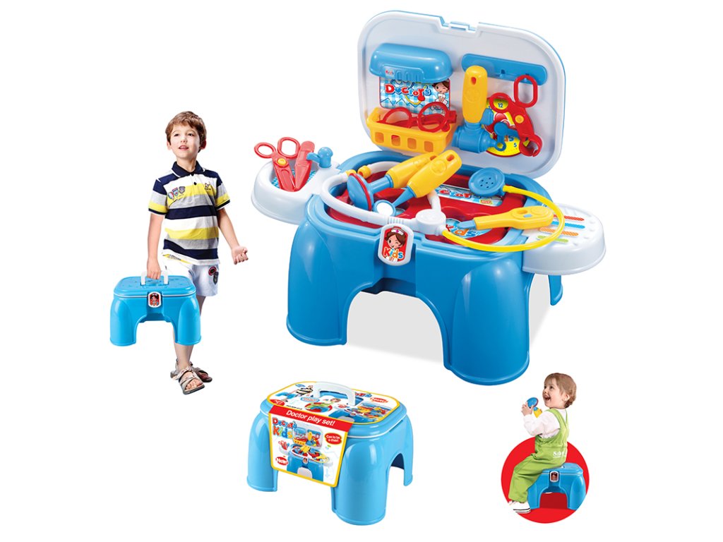 Doktorský kufřík, který může sloužit i jako sedátko. Kufřík obsahuje spoustu komponentů. Vyrobeno z pevného plastu. - Věk 3+ - Rozměr: 32x26x19cm