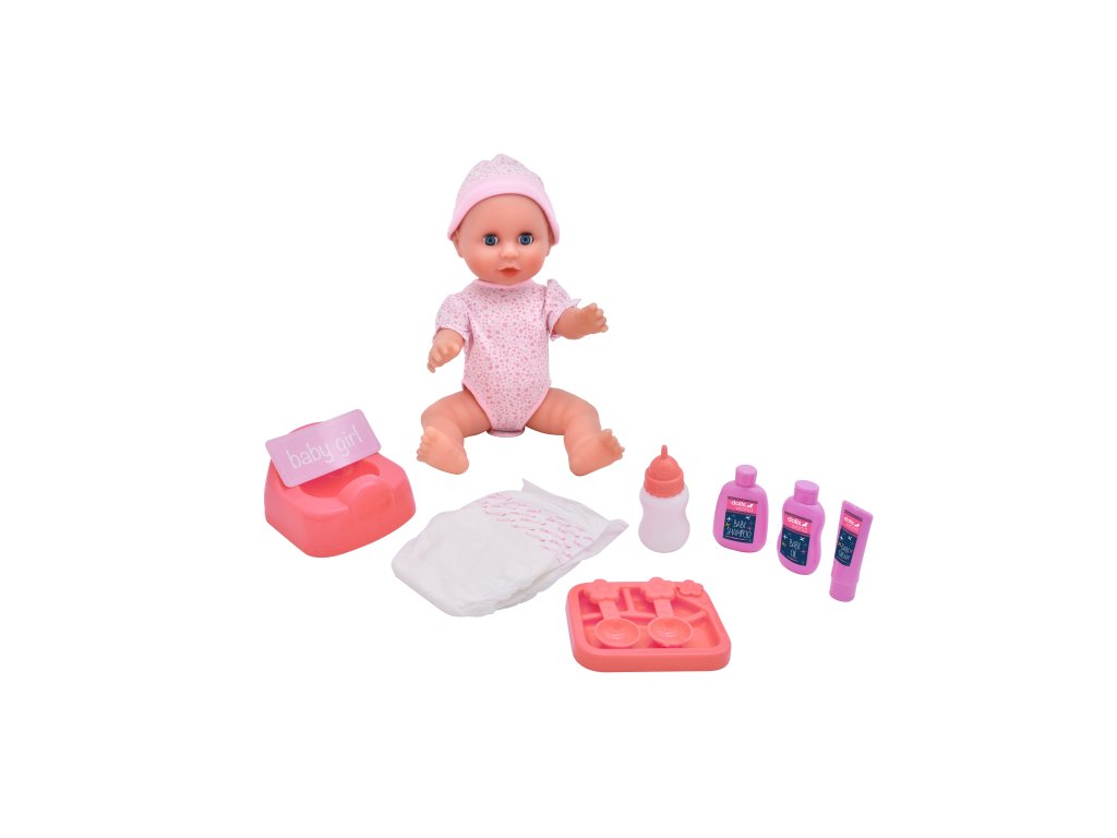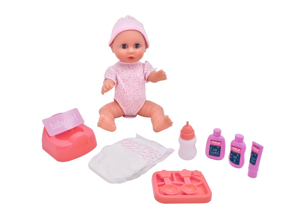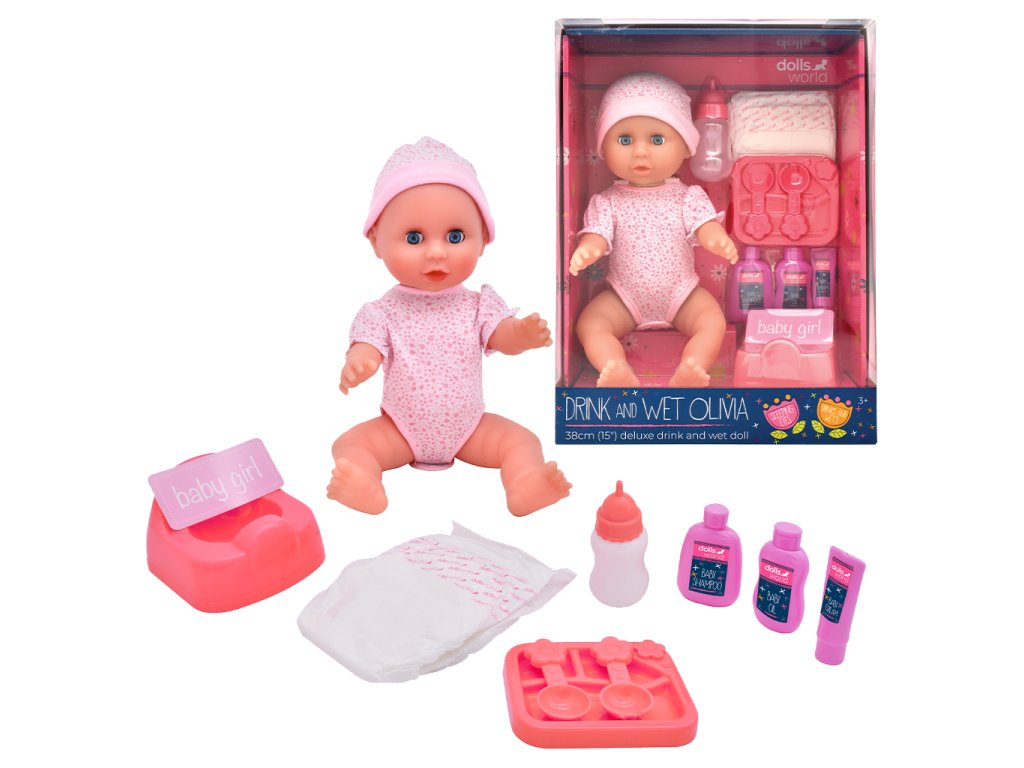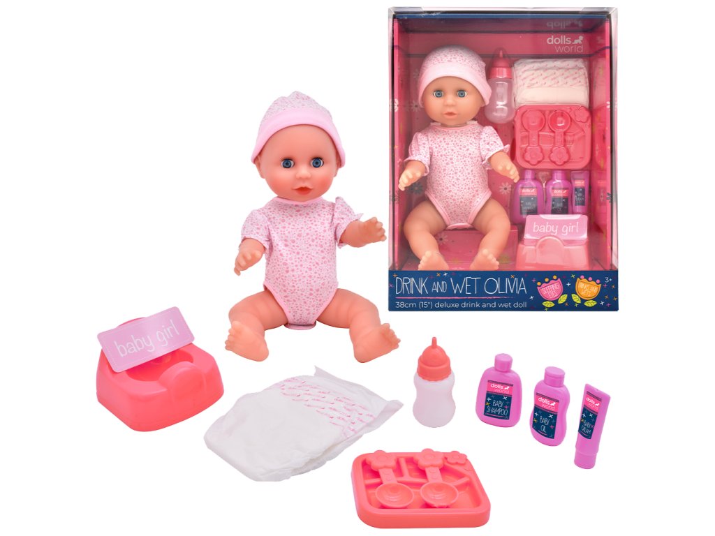 Dolls World - Miminko Olivia 38 cm pije a čůrá se zavíracími očima a příslušenstvím