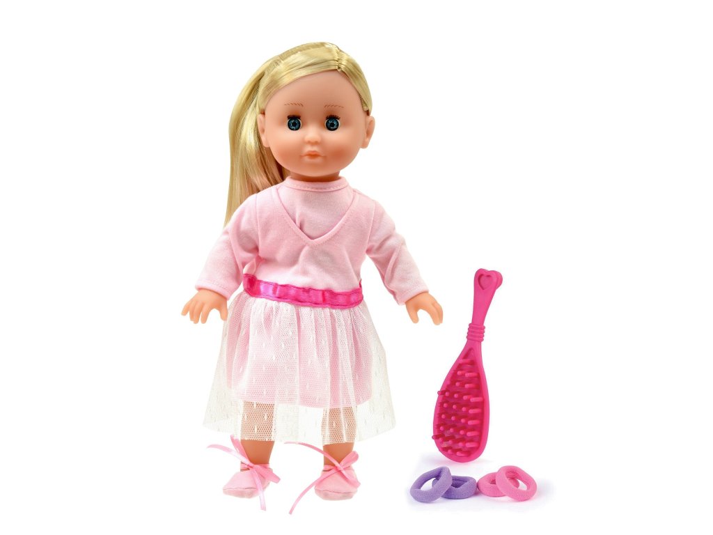 Panenka 30cm s měkkým tělem a luxusními blond vlasy a detailním oblečením. Evelyn má velmi hezkou tvář a spící modré oči, sada obsahuje kartáč na vlasy a dvě sady sponek