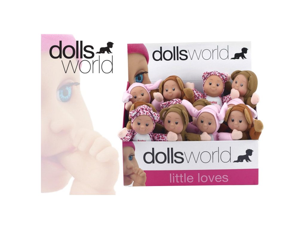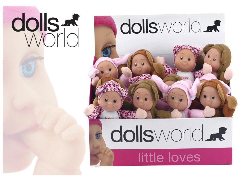 Panenka malá s měkkým tělíčkem. Panenka kamarád se zvukem chrastítko. Velikost 20cm - 4 druhy: panenka v růžovém oblečku, panenka v růžovém oblečku se zvířecím zabarvením, v hnědém a rezavém oblečku. - Ošetření látky: ruční praní ve vodě s mýdlem. - Určeno pro děti od 18 měsíců. - Uvedená cena je za kus