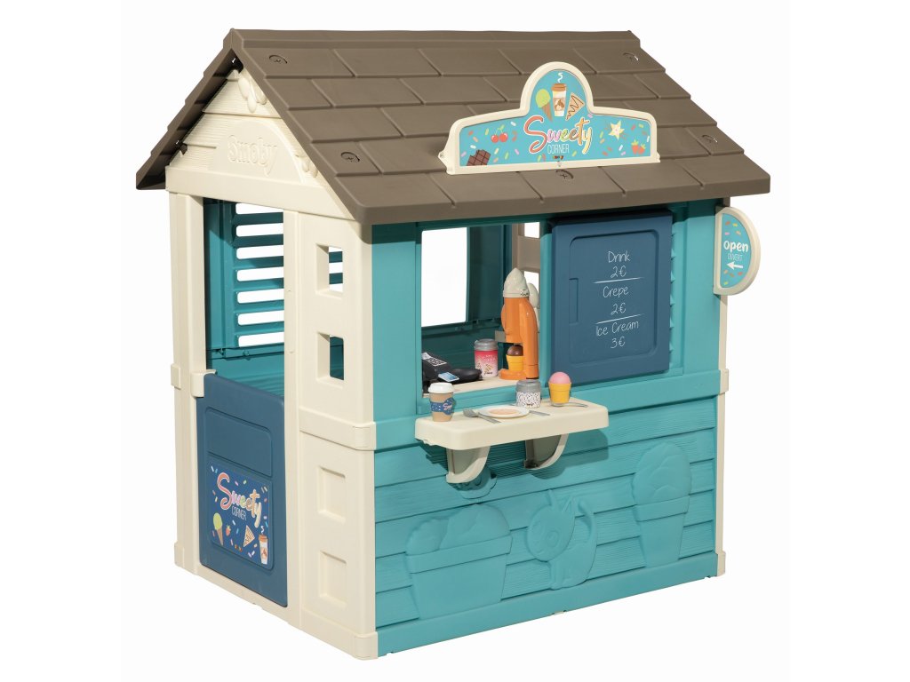 Stabilní, prostorný domeček Sweety Corner s výdejním okénkem pro dobroty sebou. S polovičními vstupními dveřmi , 2 okny s okenicemi, které lze posouvat a využít k napsání jídelníčku. Domeček má pult pro příjem objednávek od zákazníků a ve vnitřní straně má pult pro přípravu palačinek, zmrzliny a nápojů. Součástí je 18 ks příslušentsví, např. talířek, vidlička, nůž, 2 palačinky, cukřenka, pokladní doklady, kreditní karta atd. Vyrobeno z kvalitního, pevného, UV záření odolného plastu, snadné sestavení. Rozměry domečku (DxŠxV): 105 x 110 x 127 cm.
