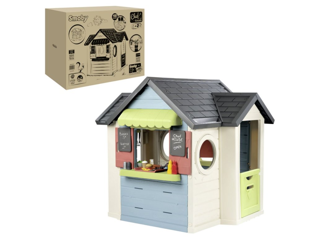Domeček Chef kombinuje zahradní domeček, restauraci a obchod. S pultem, markýzou, malou kuchyňkou, pokladnou, herním jídlem a další. Domeček má malé vstupní dveře a dvě okna s otočnými žaluziemi. Disponuje dvěmi tabulemi, na které lze napsat menu nebo otevírací dobu. Součástí příslušenství je lednice, trouba, plynový gril s pohyblivými plameny, dřez s kohoutkem, dvě police, pokladna s kalkulačkou a čtečkou kreditních karet, vč. karty. K dispozici jsou také sladká a slaná jídla, kečup, omáčky, pánvička se snadným otáčením s palačinkou, slánka a pepřenka s „cvaknutím“, příbory a nádobí. Stabilní robustní odolný plast s ochranou proti UV záření. Obsahuje celkem 48 kusů příslušenství. Domeček je kompatibilní s veškerým příslušenstvím, kromě komína. Výška dveří od země 46,3 cm. Tento výrobek obsahuje minimálně 60 % recyklovaného materiálu. Rozměry sestaveného domečku: 124 x 132 x 135 cm (DxŠxV).