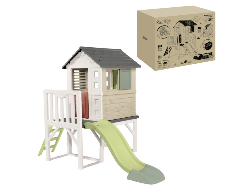Krásný domeček na kůlech vhodný na hraní s několika kamarády. Má dvě okna s okenicemi, dvířka a žebřík. Skluzavka má délku 1,5 m. Vyrobeno z kvalitního, pevného, UV záření odolného plastu. Maximální nosnost je 4 x 50 kg. Tento výrobek obsahuje minimálně 64 % recyklovaného materiálu. Rozměry domečku: 98 x 110 x 127 cm, výška kůlů 70 cm.