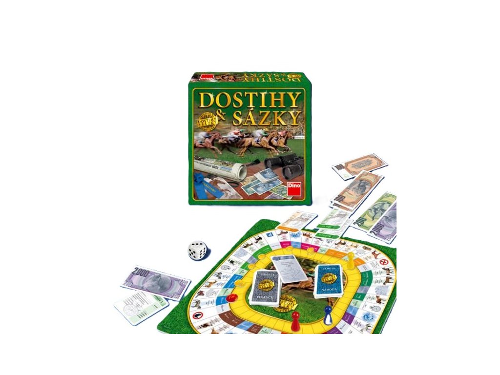 Hra Dostihy a sázky nové. Balení obsahuje 1 herní plán, 6 figurek v 6 barvách, 56 hracích karet, 90 kartonových žetonů, 260 bankovek, 1 bodovou hrací kostku a 1 pravidla. Hra je určena pro 2 - 6 hráčů. Vhodné od 10 let.