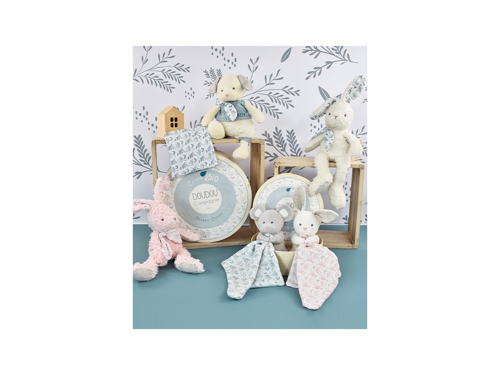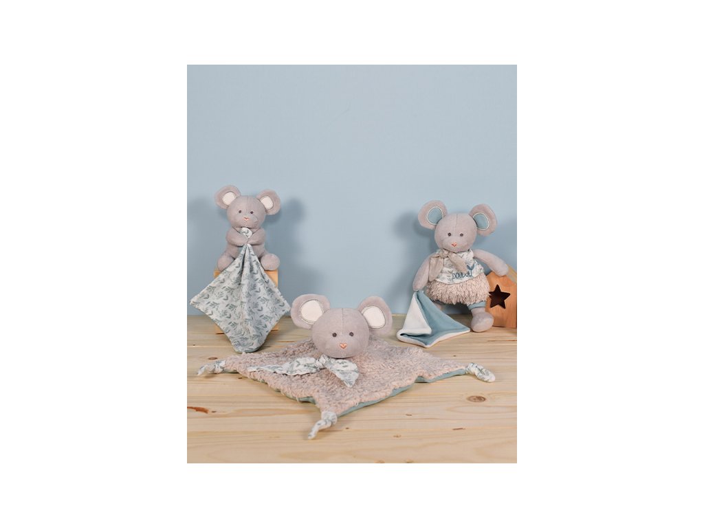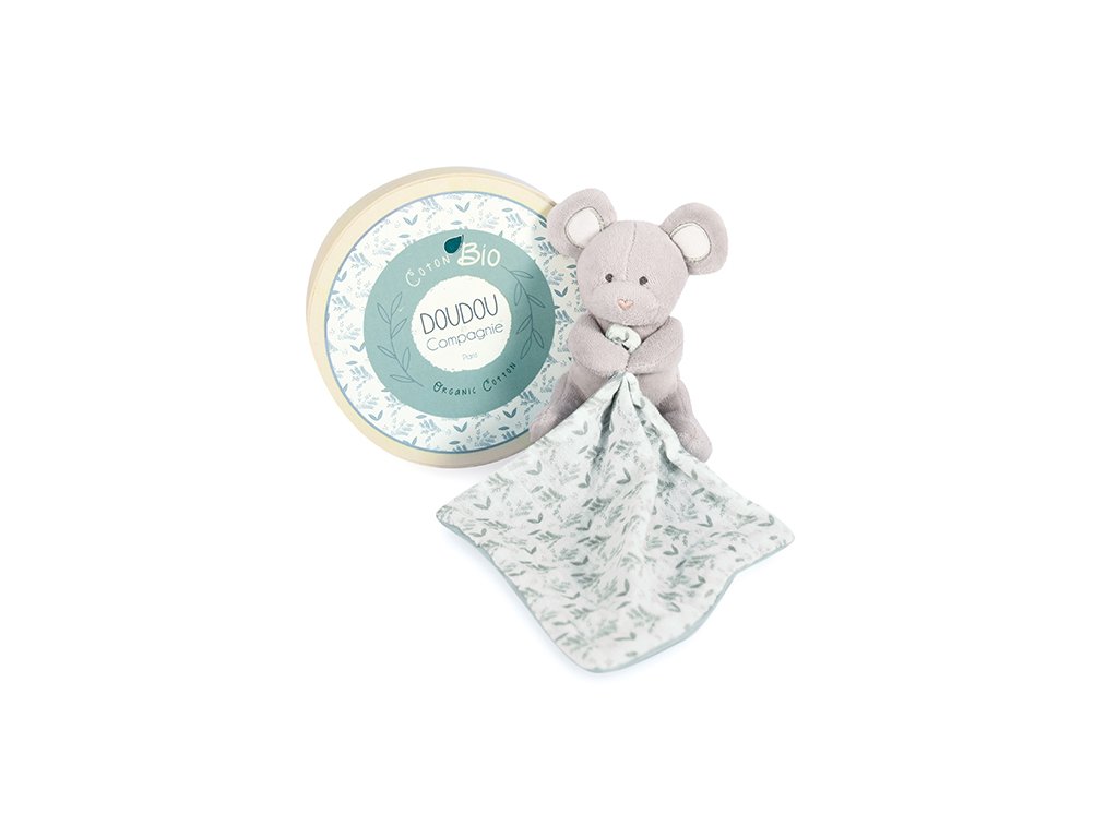 Doudou Dárková sada - Plyšová myška s dečkou z BIO bavlny 15 cm zeleno-bílá