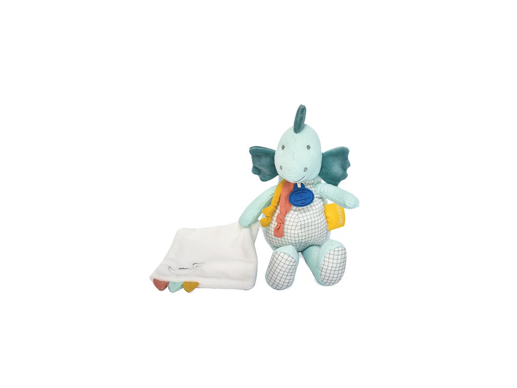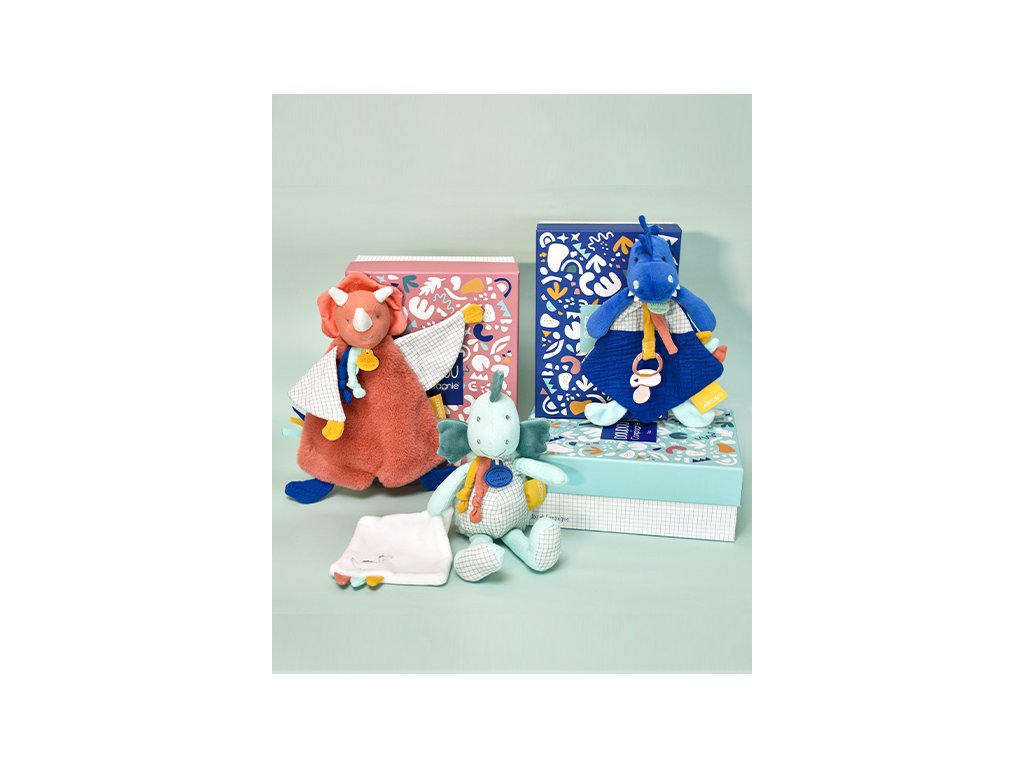 Dinosaurus se rychle stane nerozlučným společníkem Vašeho dítěte. Tento rozkošný dinosaurus v mentolově zelené barvě s dečkou, je extrémně měkký a příjemný na dotek. Rozvíjí smysly a zvědavost. S tímto plyšákem se dobře manipuluje dětem už od od prvních týdnů svého života. Tato hračka je dodávána v nádherné dárkové krabičce s grafikou evokující modernost i luxus. Ideální jako dárek k narození dítěte. Údržba: Perte v lázni na 30°. Přirozené nebo nízkoteplotní sušení. Hlavní vlastnosti: měkký plyš, prémiový materiálv souladu s evropskými normami CEkamarád, polštářek, nebo také výzdoba dětského pokojevhodné od narození