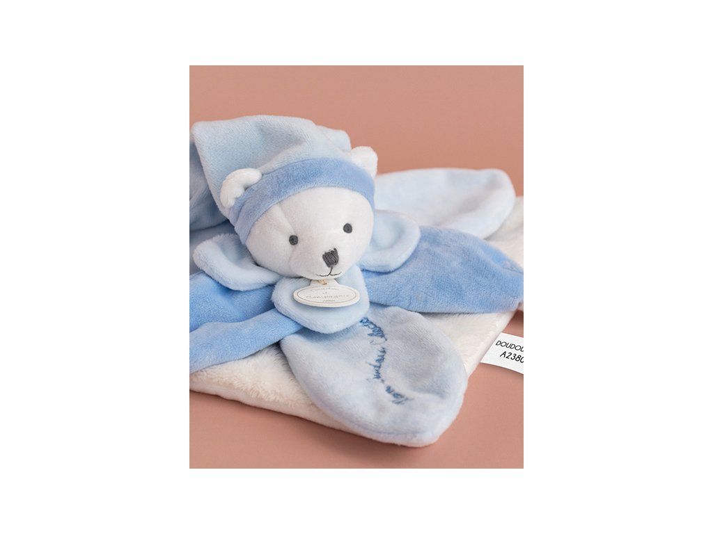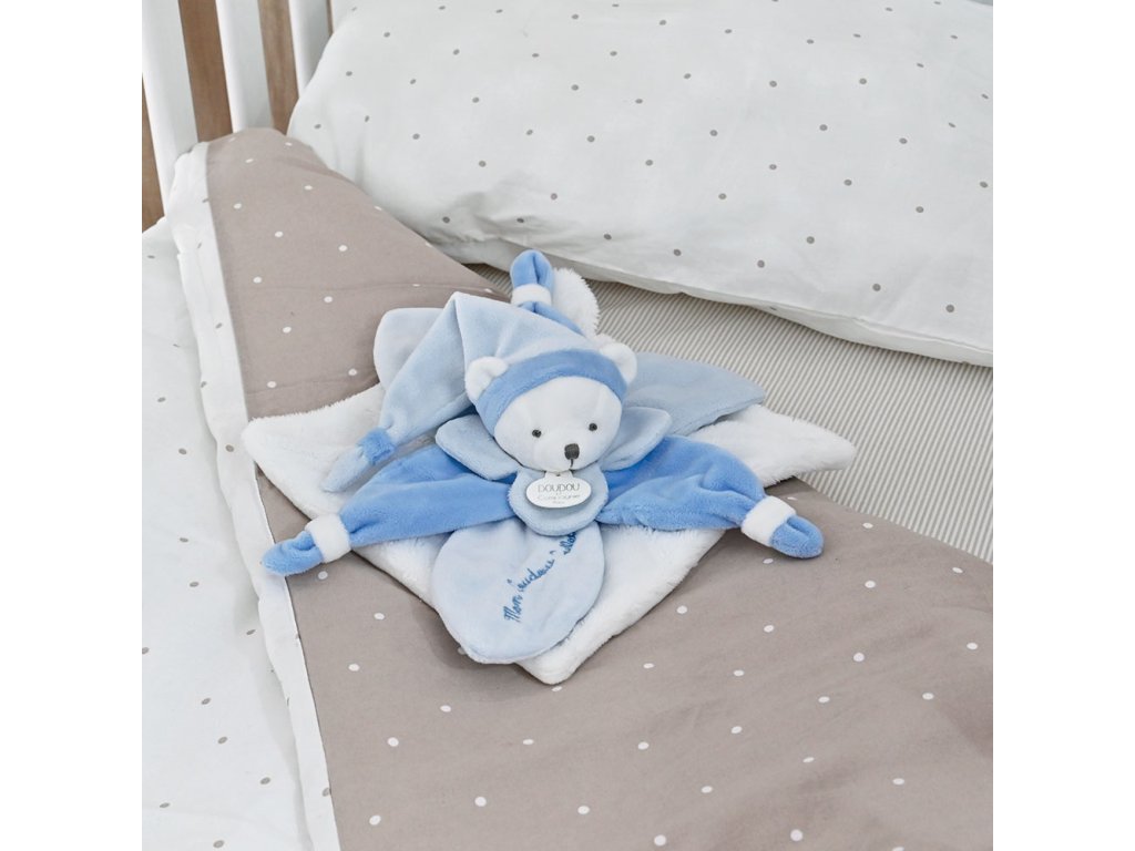 Doudou Dárková sada - plyšový muchláček modrý medvídek 24 cm