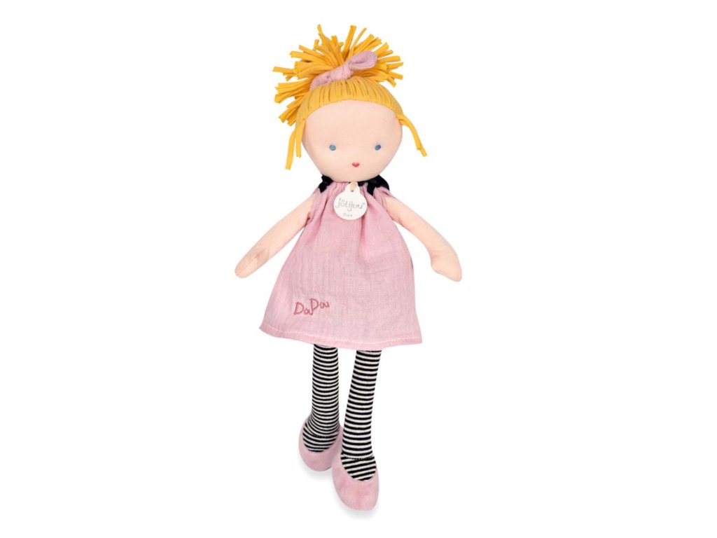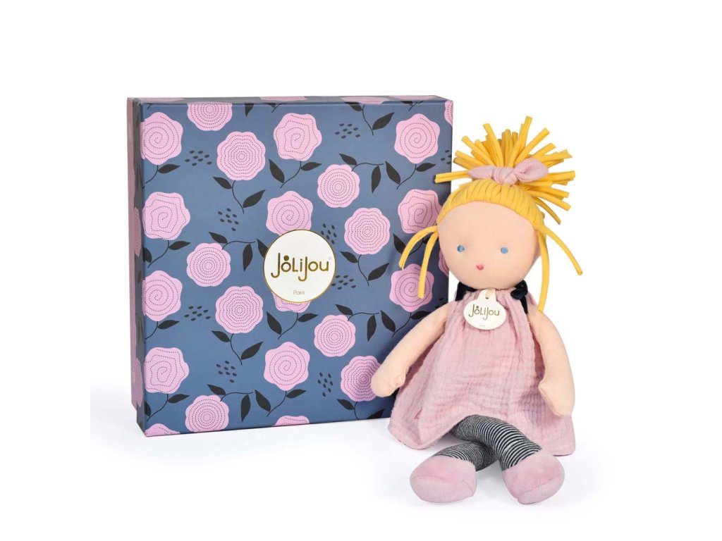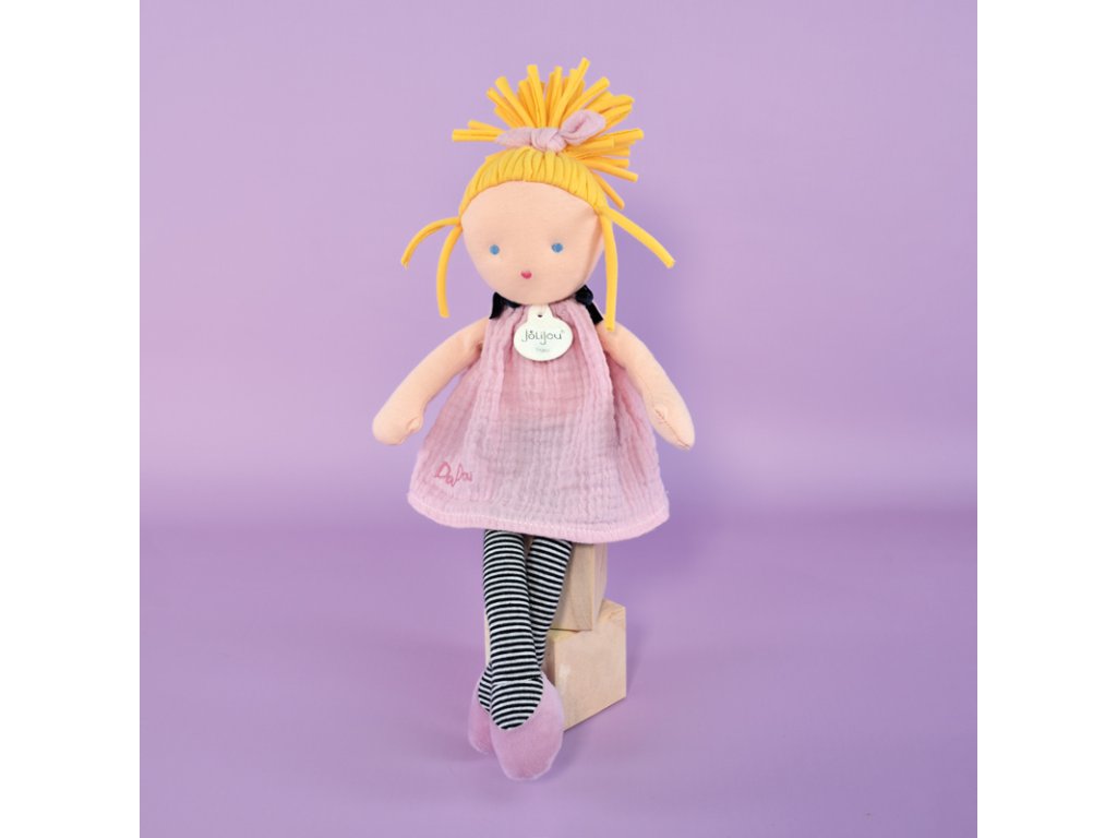 Tato roztomilá panenka má svůj boho styl. Panenka Inés je oblečená v pruhovaných punčoškách. Její růžové balerínky a růžové šatičky přesně podtrhují její styl. A aby byla ještě víc šik má navíc své "špagetové" blond vlasy stažené do culíku. Panenka je dodávána v dárkové krabičce. Údržba: Perte v lázni na 30°. Doporučení: Přirozené nebo nízkoteplotní sušení. Hračka splňuje evropské bezpečností CE normy. Hlavní vlastnosti: vhodné od narozeníbavlněný obličej, vyšívané oči a ústa vyšitá do tvaru srdíčkapanenka s doplňkyv dárkové krabičce