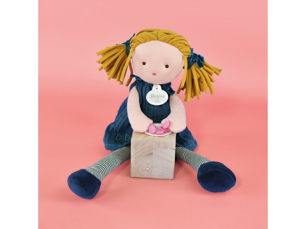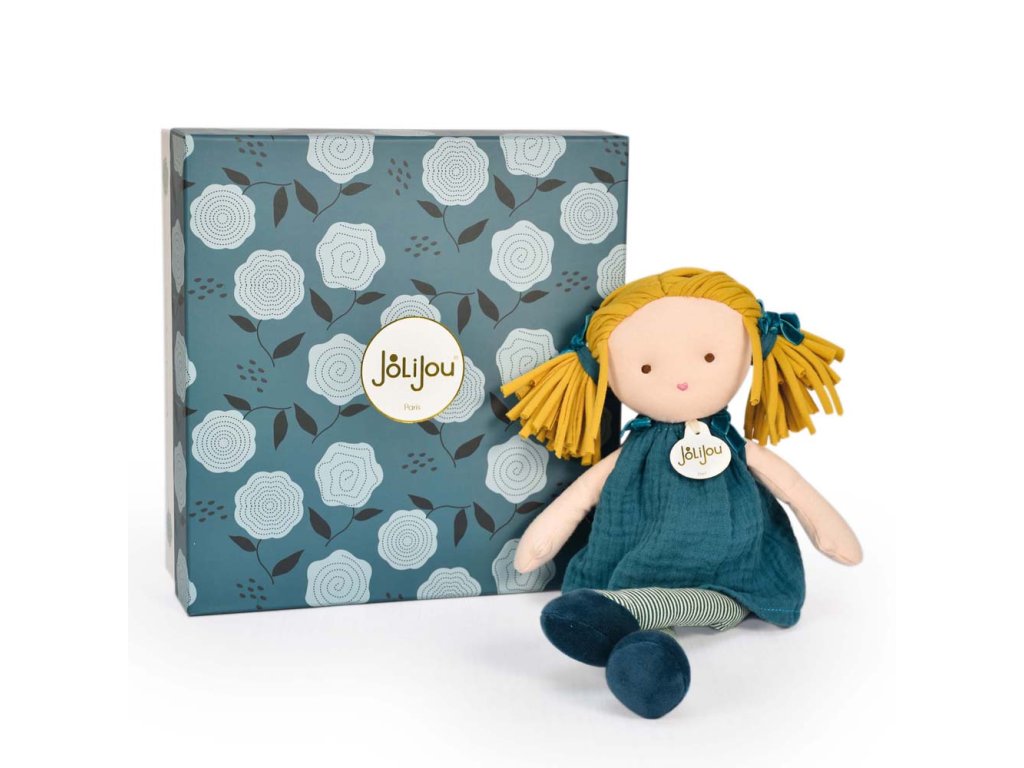 Tato roztomilá panenka má svůj boho styl. Panenka Jade je oblečená v pruhovaných punčoškách. Její balerínky a tyrkysové šatičky přesně podtrhují její styl. A aby byla ještě víc šik má navíc své "špagetové" blond vlasy stažené do culíků. Panenka je dodávána v dárkové krabičce. Údržba: Perte v lázni na 30°. Doporučení: Přirozené nebo nízkoteplotní sušení. Hračka splňuje evropské bezpečností CE normy. Hlavní vlastnosti: vhodné od narozeníbavlněný obličej, vyšívané oči a ústa vyšitá do tvaru srdíčkapanenka s doplňkyv dárkové krabičce
