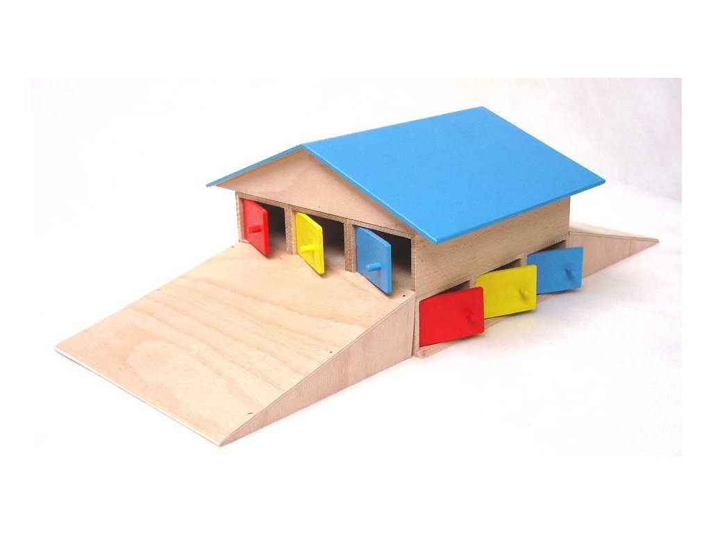 Domek plný garáží - to je něco pro kluky! Z každé strany domečku jsou tři samostatné garáže, ze dvou stran je nájezd do 1. poschodí. Vhodné pro autíčka do rozměru 10 x 5 cm. Hlavní vlastnosti: garáž pro 12 aut zlepšuje koordinaci v zábavném prostředípoužité barvy jsou zdravotně nezávadné