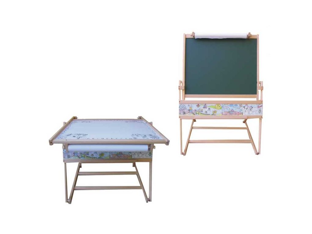 Oboustrannou tabuli během chvilky změníte na stolek. Předělávku zvládne i dítě, není nutné žádné šroubování. Líc je nabarven tabulovou barvou a je na křídy, rub je bílá fólie na fixy, navíc má číslice, abecedu a obrázky.