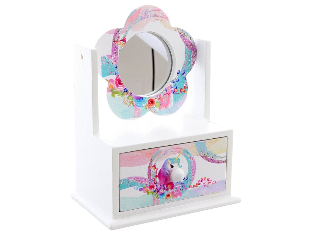 Dřevěná dětská šperkovnice (kosmetický stolek) se zásuvkou, do které si mohou malé slečny ukrýt své náramky, prstýnky, korálky a jiné ozdoby. Součástí zrcátko kytička. V dolní části šuplíček s motivem jednorožce.