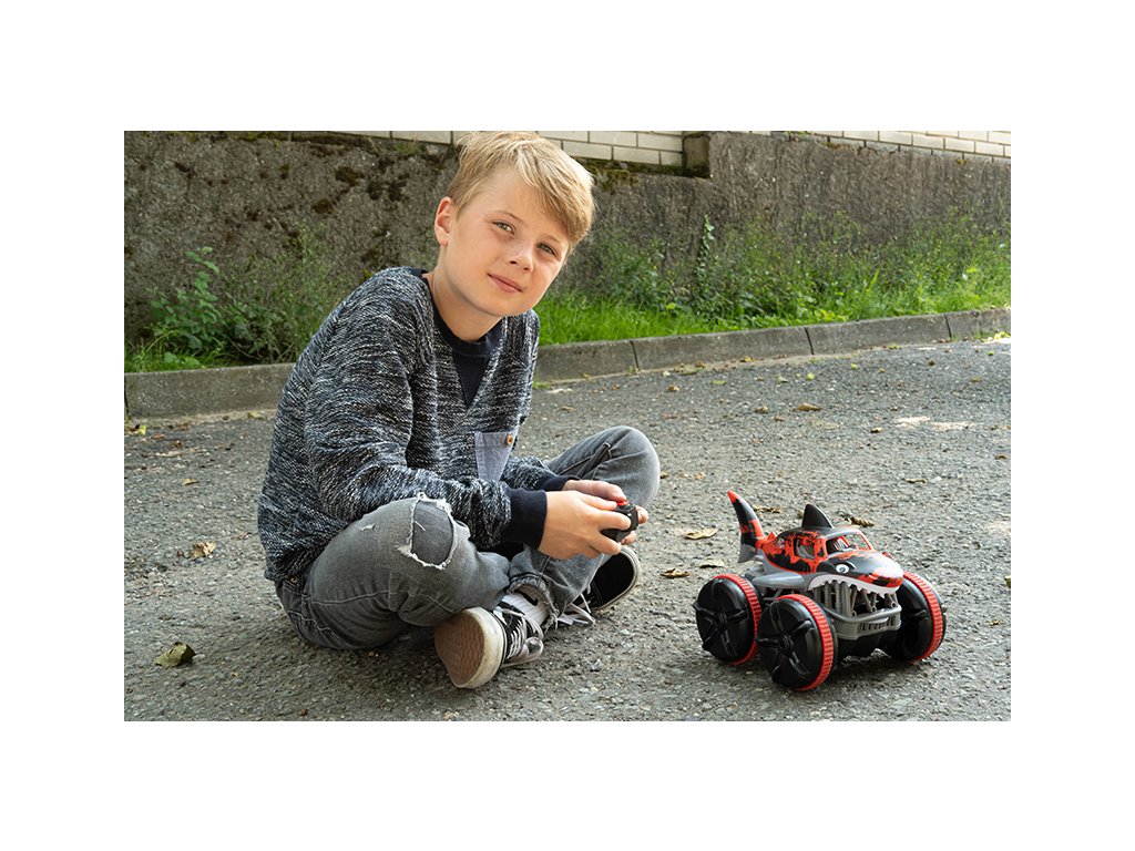 Auto na dálkové ovládání, které jezdí nejen po zemi, ale i po vodě. Ani neupravený terén mu nedělá problémy. Auto jezdí všemi směry a při jízdě mu barevně svítí kabina. Zadní ploutev se při jízdě ve vodě hýbe a vypadá to jako, když plave žralok. Nabíjení cca 4 hodiny, doba jízdy cca 20 minut. frekvence 2,4 Ghz. Auto dokáže stoupat až 45 stupňů. Umí rotace 360 stupňů na místě.