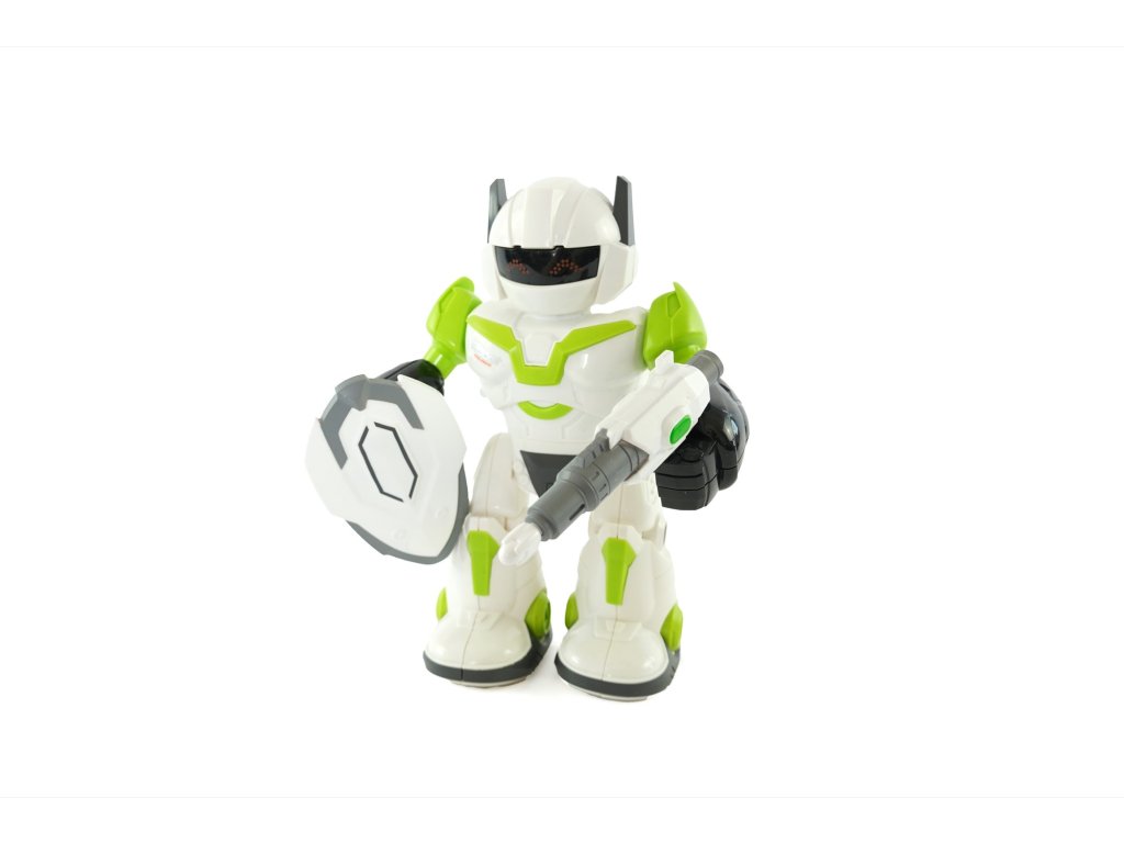Robot na baterie, výška 20cm chodí, vydává zvuk, svítí mu oči a chodí. Otáčí tělem se o 360 stupňů. V ruce drží zbraň a štít.