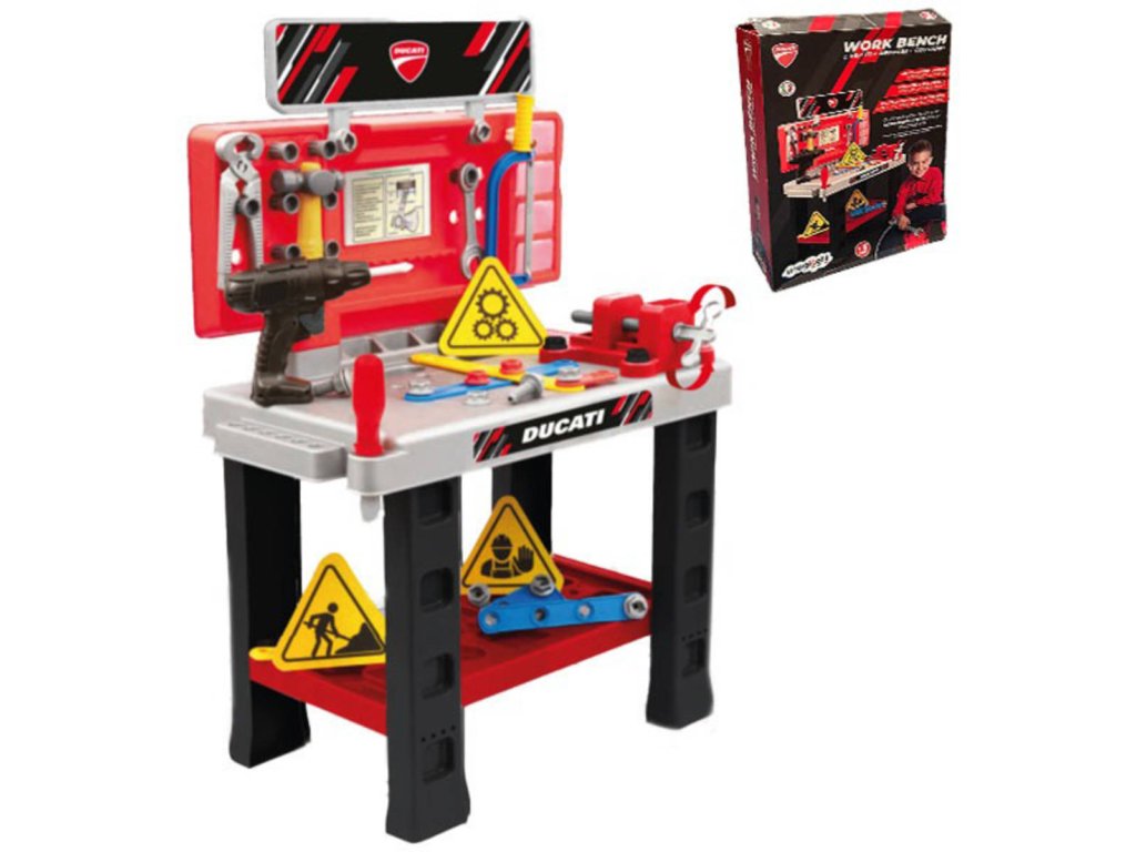 Pracovní stůl ponk v licenci Ducati, o velikosti 50 x 35 x 75cm. Součástí dětské plastové nářadí (celkem 30ks). Malý kutil.