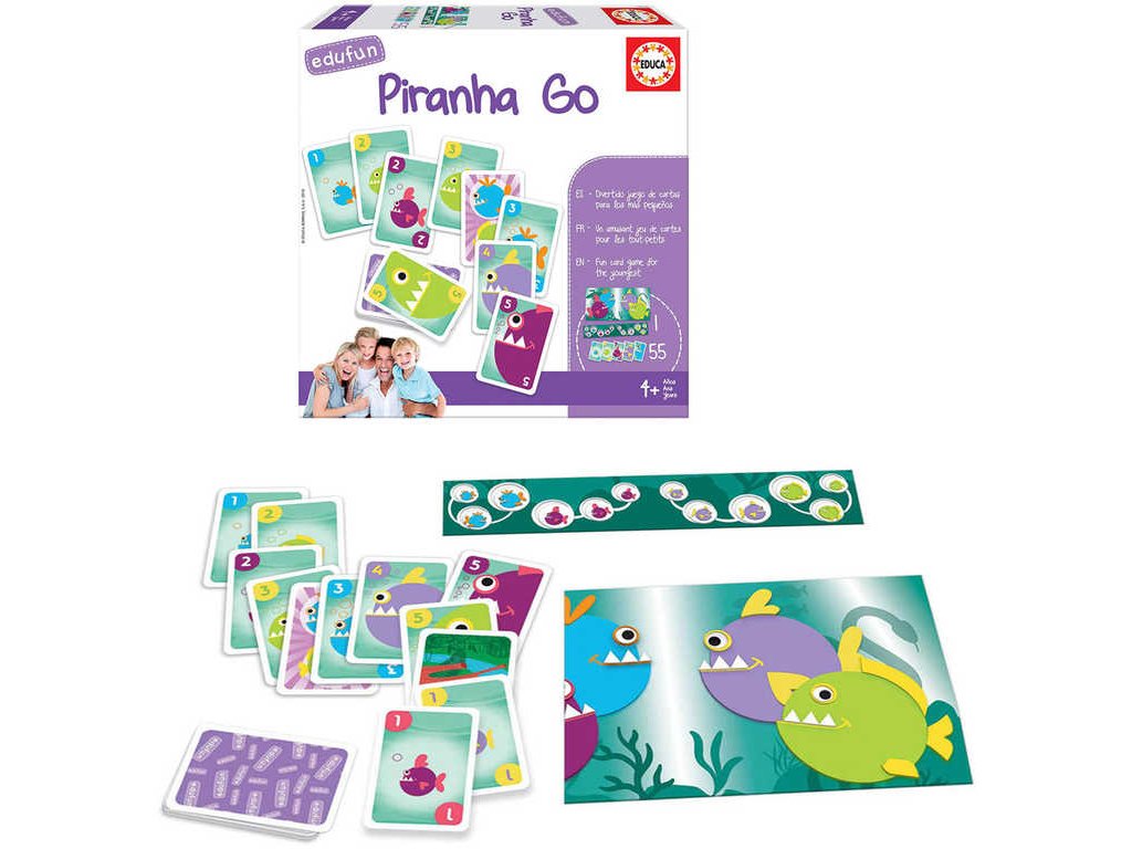 Zábavná desková hra s kartami – EDUCA – Piraně je určena pro děti od 4 let. Cílem hry je zbavit se karet s piraňami dřív než ostatní hráči. Dávej pozor! Řeka je plná nebezpečí.