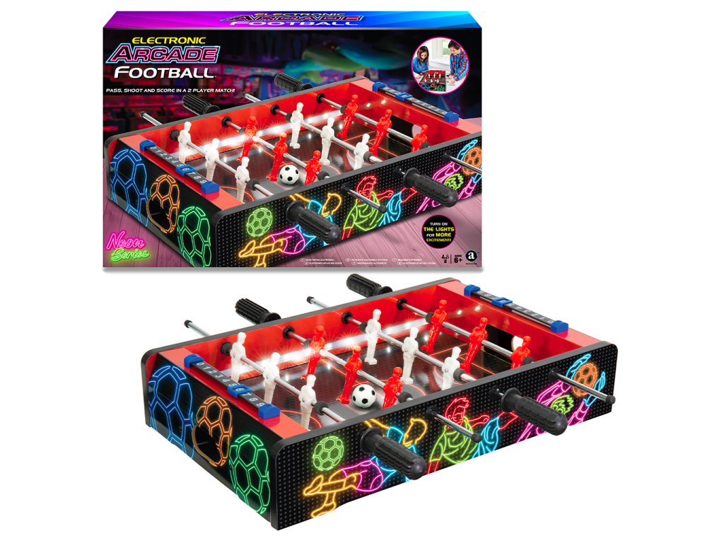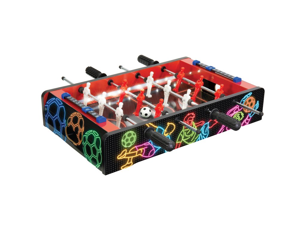 Stolní fotbal – Neon Series přináší vzrušení arkádové hry přímo k vám domů! Zahrajte si rychlou fotbalovou bitvu se střelami na branku, přesnými přihrávkami a tvrdými souboji o míč a zároveň si užijte efektní LED osvětlení hrací plochy. Pro 2 hráče – souboje tváří v tvář plné zábavy a adrenalinu. Vestavěné počítadlo zásahů – sledujte skóre a kdo vede. Robustní dřevěná konstrukce – kompaktní rozměry se vejdou ke stolům i pultům, při uskladnění zabere minimum místa. Stylové neonové vzory – moderní design, který upoutá pozornost. Pogumovaná madla – pevný úchop a vynikající kontrola nad hráči. Kdo jako první vstřelí 9 gólů a oslaví vítězství? Technické údaje: Napájení: 3× baterie AA 1,5 V (není součástí balení) Vhodné pro děti od 6 let Obsah balení: 1× dřevěný stolní fotbal, příslušenství, návod k použití