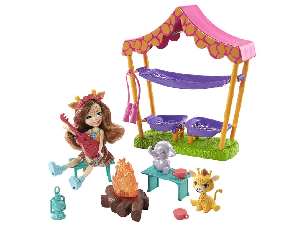 Prozkoumejte Sunny Savanna ™ se žirafou Griselda Giraffe ™ a jejími zvířecími nejlepšími kamarády! Tento herní set Enchantimals Savannah Sleepover ™ je plný her na vyprávění příběhů. Shromážděte se na lavičkách a usedněte u táboráku pro speciální čas sbližování Enchantimals ™ pomocí zábavného příslušenství, jako je kytara, hrnky, lucerny a další. Pak jděte do stanu pro sladké sny Savany! Pod „listovým“ stropním ventilátorem, který se točí, je houpací síť pro žirafu Griseldu, plus 2 postele pro žirafu se jménem Antenna ™ a slona se jménem Stompah ™! Malé děti si budou rády hrát na speciální pouto, které sdílejí přátelé Enchantimals ™! Barvy a dekorace se mohou lišit.