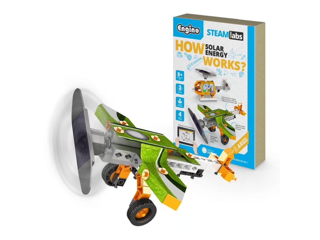možnost sestavit 4 modely, stavebnice umožňuje: 1. level sestavení modelu, 2. level vymalování papírových dílů, 3. level experimentování, 4. level učení se, aplikace Engino kidCAD zobrazující 3D model