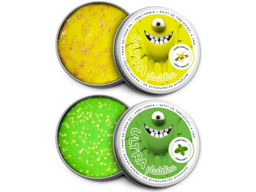 ULTRA Plastelína je unikátní hmota s výjimečnými fyzikálními vlastnostmi. Skvěle se tvaruje, natahuje se jako žvýkačka, skáče jako hopík, trhá se jako papír, funguje jako skvělá antistresová pomůcka. Můžete si vybrat z celkem 4 barevných kombinací různých vůní. Tato Ultraplastelína navíc obsahuje glitry polystyrenové kuličky, které při hnětení vydávají příjemný praskavý zvuk.