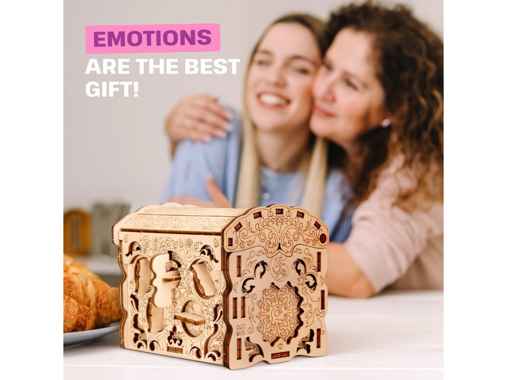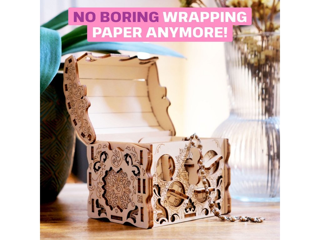 Už žádný nudný balící papír! Emoce jsou nejlepší dárek... Věnujte dárek s překvapením a zažijte strhující zábavu díky Secret Lock Box skládačce. Chcete najít tajemství ukryté v tajné schránce? Sdílejte s přátely zábavné okamžiky a soutěžte v odhalování mechanismu. Kdo první odhalí tajemství? Prokažte svou vynalézavost a vyřeště všechny hlavolamy. Věnujte dárek s překvapením, anebo skryjte svá vlastní tajemství díky tomuto vysoce kvalitnímu boxu s jedinečným designem. Secret Treasure Box je dokonalý pro uložení věcí, které jsou vašemu srdci drahé. Elegantní tvar jej proměňuje v umělecké dílo, které bude ozdobou každého interiéru. Vyroben byl šetrně k životnímu prostředí, ze 100% přírodních materiálů a všechny jeho části byly přesně vyřezány nejlepší laserovou technologií. Splňuje všechny evropské bezpečnostní normy. Hlavní vlastnosti: vyrobeno ze 100% přírodních materiálůexkluzivní designprecizně vyřezano nejlepší laserovou technologiípoužitelné opakovaněvhodné jako kreativní dárek s překvapením