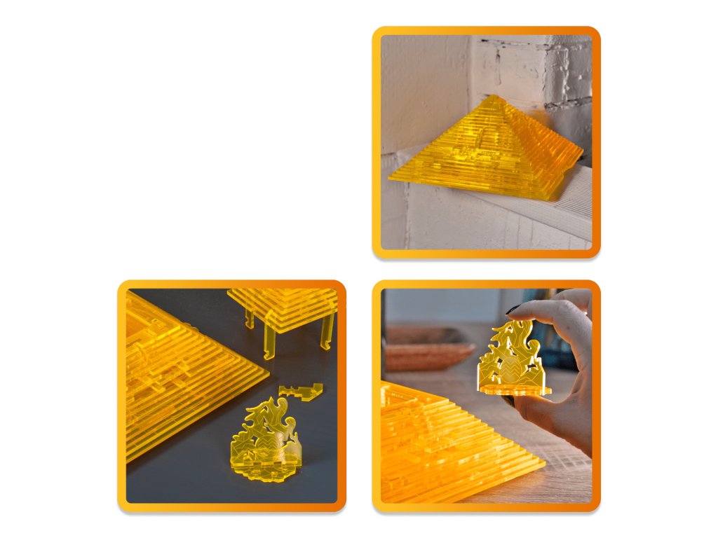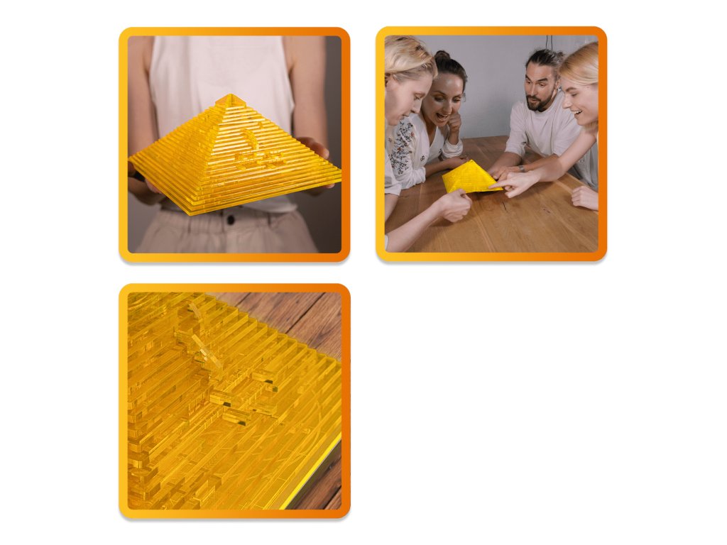 Po tisíce let střežili egyptští učenci a kněží pokladnici vědění, zdroj skutečné moci. Ukryli se hluboko ve starobylé pyramidě plné magických pastí a hádanek, aby odradili nezvané hosty a střežili tajemství před nepovolanými. Ani faraoni, ani největší vzdělanci perské říše nedokázali proniknout dovnitř a odhalit posvátnou moudrost Egypťanů. Máte odvahu překonat všechny nástrahy starověkých architektů a vyzvednout ztracené znalosti? Využijte jedinečnou příležitost a vydejte se na vzrušující dobrodružství, rozluštěte záhadu pyramidy a vyzvedněte poklady ze síně vědění! ∗★∗ Hlavolamy Escapewelt nově v luxusním provedení z průhledného barevného akrylátu! Vysoce kvalitní a odolný materiál promění propracované puzzle v nevšední a zářivý šperk. Zakuste atmosféru únikových her s originálními scénáři a hádankami u Vás doma! Každý hlavolam ukrývá malou přihrádku, kterou můžete kreativně využít k úschově vodítka ve vlastní dobrodružné hře, nebo zpestření zážitku z drobného dárku. Součástí každého balení je jednoduchý obrázkový návod, který obsahuje také QR kód vedoucí na stránku s nápovědou. Rébus má vždy jedno řešení, kvalitním provedením je ale předurčen k dalšímu použití, neváhejte jím proto dále obdarovat a vyzvat své přátele, nebo členy rodiny. Hlavní vlastnosti:luxusní provedení z čirého akryláturozměry vnitřní přihrádky 5×5×5 cmvysoká obtížnost řešenívyrobeno v EU