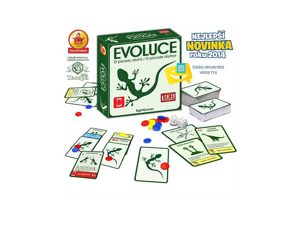 Evoluce živočišných druhů je nevyhnutelná. V této hře se musíš změnit abys dokázal přežít, jinak Tě sežerou. Připrav se na boj o holou existenci a přežití. Na začátku jste živočichem, který je rád, že existuje. Vaším úkolem je zvolit správnou taktiku a získávat pro něj karty s užitečnými schopnosti, vhodnými pro přežití v různých prostředích. Zároveň musíte bojovat o potravu s ostaními tvory ve hře. Záleží na vás a na prostředí, jestli se stanete hbitým predátorem nebo velkým plovoucím zvířetem. Čím více živočichů stvoříte, tím větší šanci máte na vítězství. Taktizujte, přemýšlejte o svých přednostech a slabinách soupeře. Jste na samém začátku vývoje, záleží jen na vás, zda přežijete. Přínosem pro mladší hráče je, že zatímco se hráči snaží vybudovat stabilní populaci živočichů s nadvládou na ostatními, seznamují se zároveň s principy evoluce a přirozeného výběru. Unikátní společenská hra pro 2-4 hráče (s rozšířením 6 hráčů) od 12 let. Skvělá také jako úvod do evoluce do školní hodiny biologie. Evoluce živočišných druhů je nevyhnutelná. Změň se, nebo vymřeš! Připravte se na boj o holou existenci a přežití. Hru s oblibou také využívají kantoři-biologové na základních školách k zábavnému a chytlavému výkladu o Darwinově původu živočišných druhů. Autorem pravidel hry je vědec-biolog Dmitrij Knorre. Hra obsahuje: 84 ks karet živočichů a vlastnostíbarevné žetony tukových zásob a potravy (4x žlutý, 7x modrý, 14x červený)2 ks šestiboké kostkyčeský a slovenský návod ke hře Hlavní vlastnosti: nejlepší novika Roku 2014 v ČRvzdělávací a zároveň zábavná Dokumentace: návod ke hře CZ,SK
