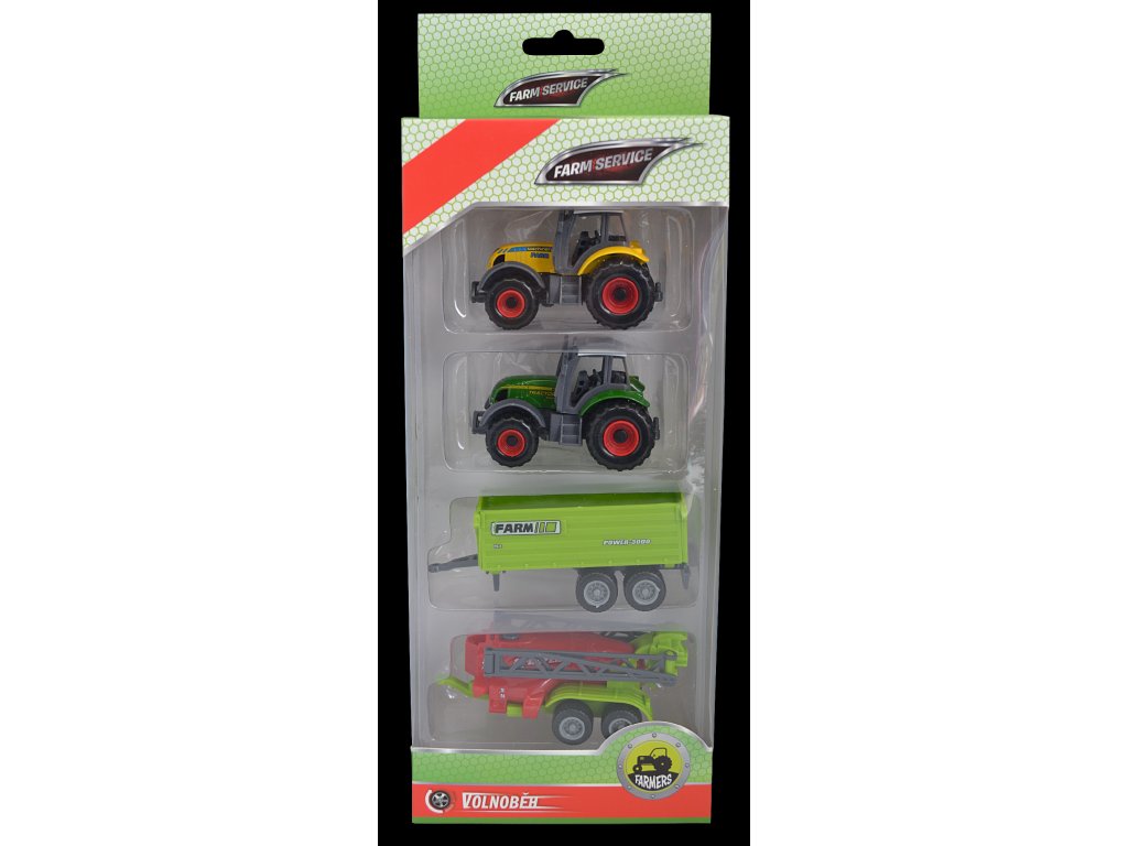 FARM SERVICE - Set zemědělských strojů: 2x traktor, valnik, postřikovač 1:64