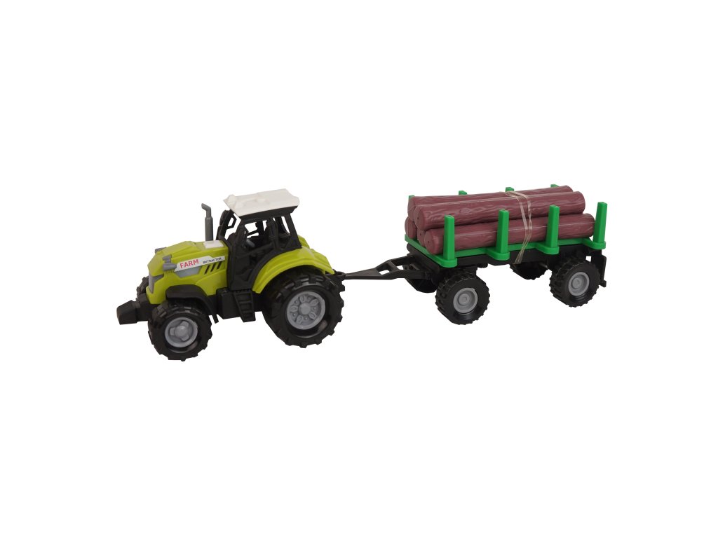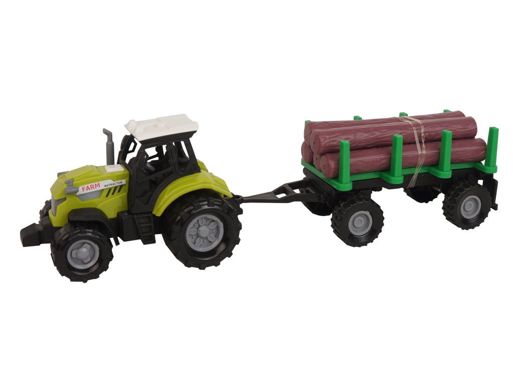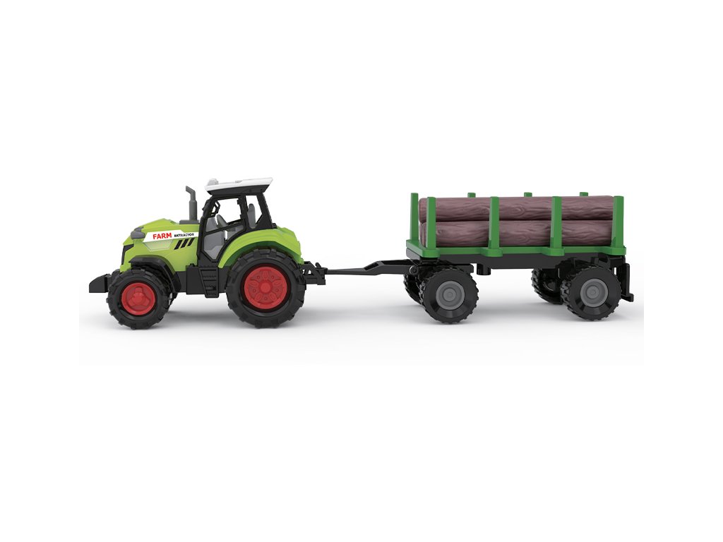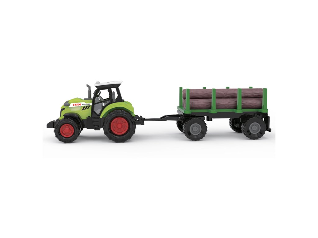 Moderní plastový farmářský traktor s vlečkou na dřevo, hračka z kolekceFARM SERVICE. Valník se dá jednoduše odpojit a klády sundat. Traktor jezdí na volný chod a jeho délka je 10 cm. Valník je v délce 11 cm Celková délka včetně přívěsu je 25 cm. Zmáčknutím tlačítka na traktoru vydává reálné zvuky spolu se světelným efektem. Traktor vyžaduje 3 ks baterií typu AG13/LR44, které jsou součástí balení.