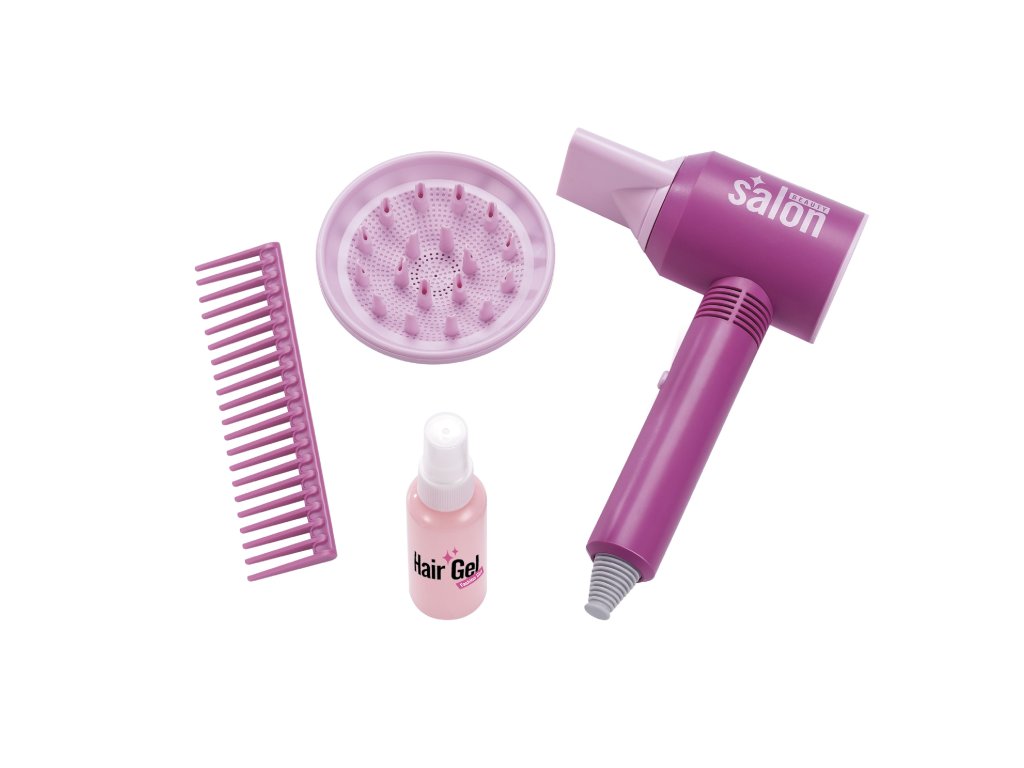 Fén s příslušenstvím. Velikost fénu 19cm. Obsahuji fén s nástavci, hřeben lahvičku na přípravek na vlasy. Skutečně fouká vzduch. Přepínač má tři polohy: 2rychlosti a vypnutí. 3xAAA baterie nejsou součástí.