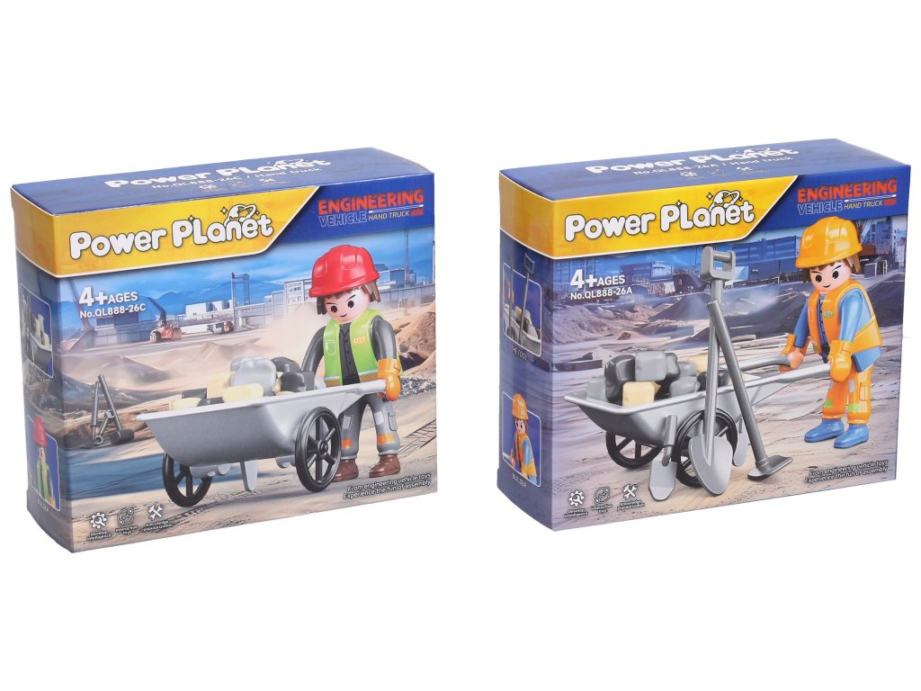 Figurka dělník s kolečkem stavebnice. Velikost kolečka 8,5 cm. Velikost figurky 7 cm. Obsahuje: figurku dělníka, kolečko, náklad, nářadí, návod. Display box - 8 ks. 4 varianty.