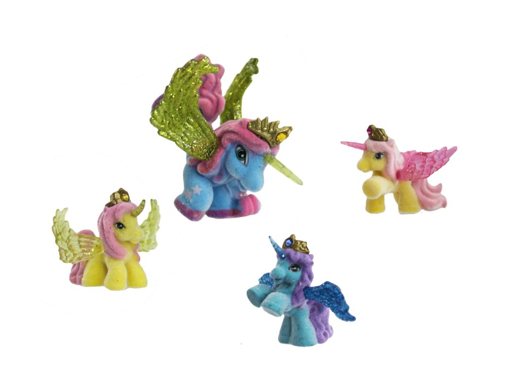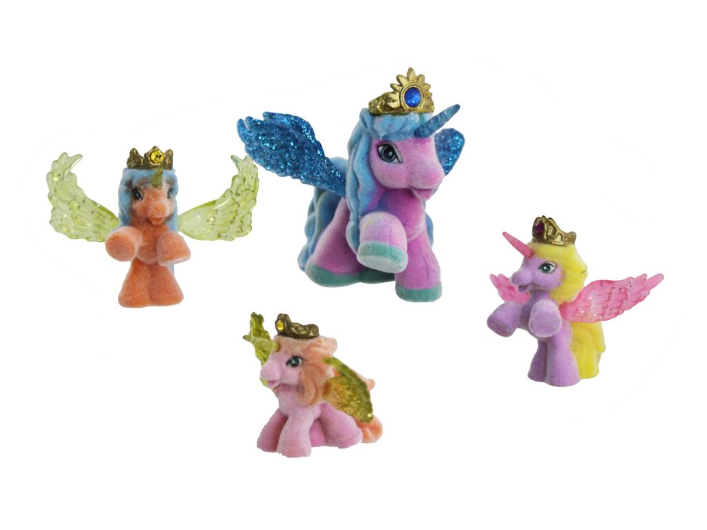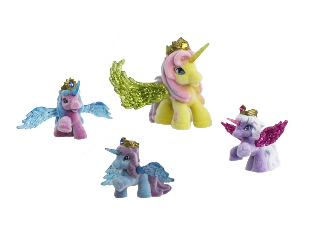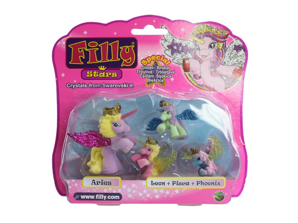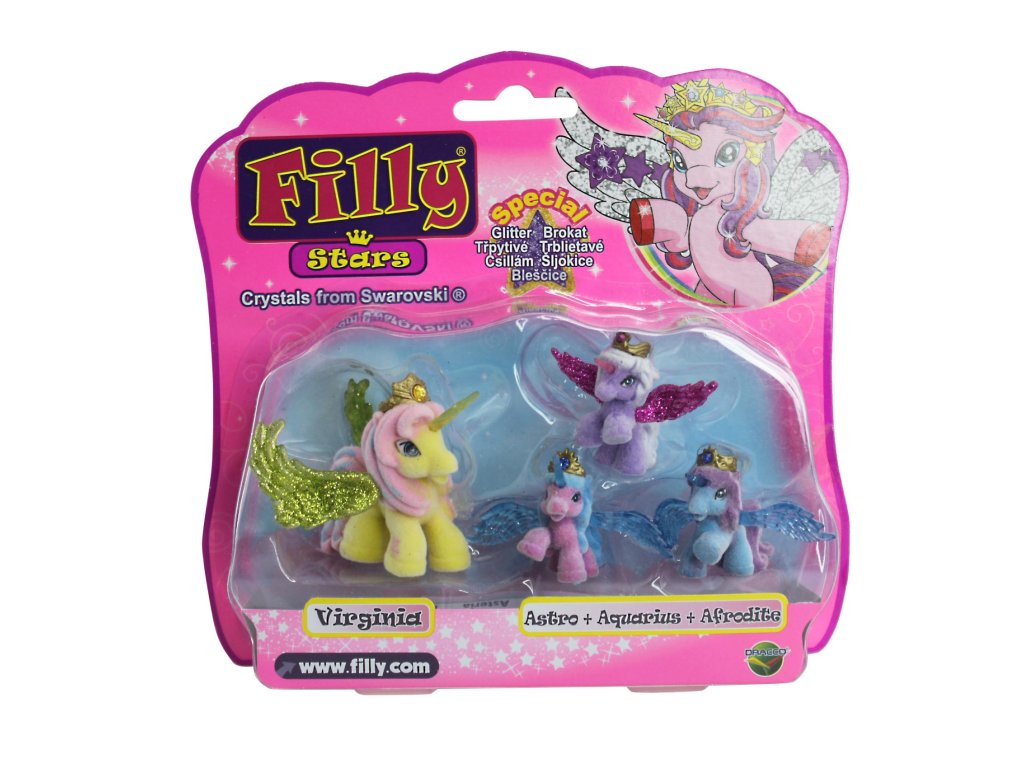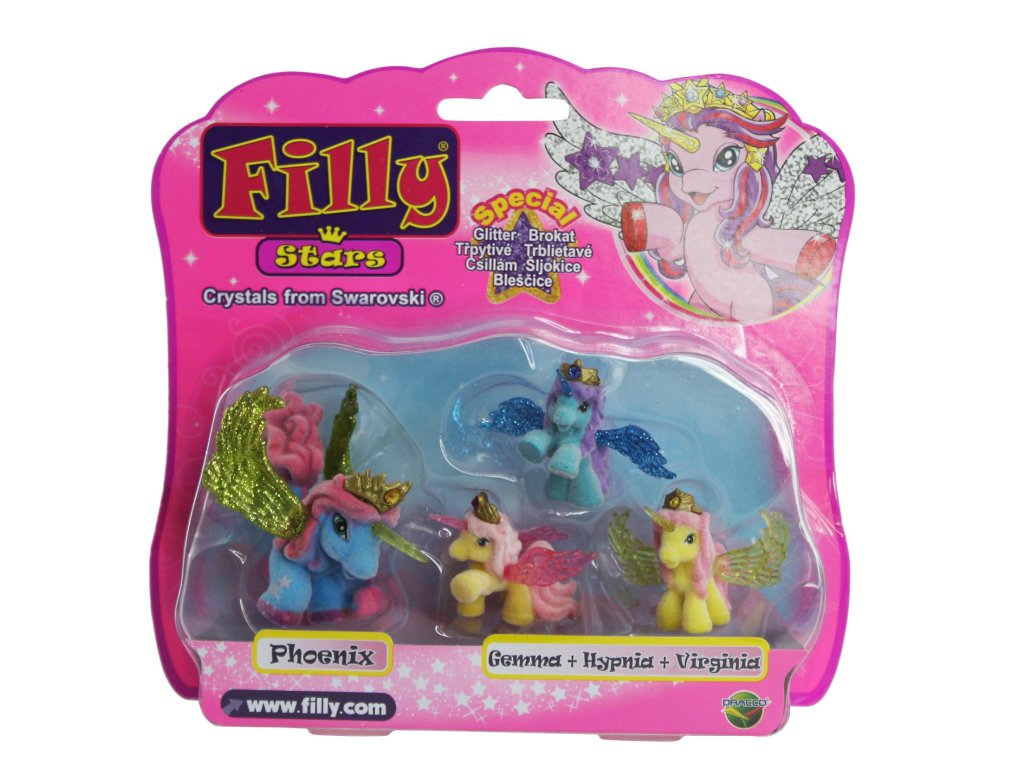 Z velmi vzdálené tajuplné země k vám přicválali noví Filly koníčci, koníčci Filly Stars. Mají kouzelné rohy a překrásná třpytivá křídla. Každý koník má zlatou korunku, kterou zdobí barevný křišťál. Doplňte svoji sbírku o Filly koníčka se třemi malými koníčky.