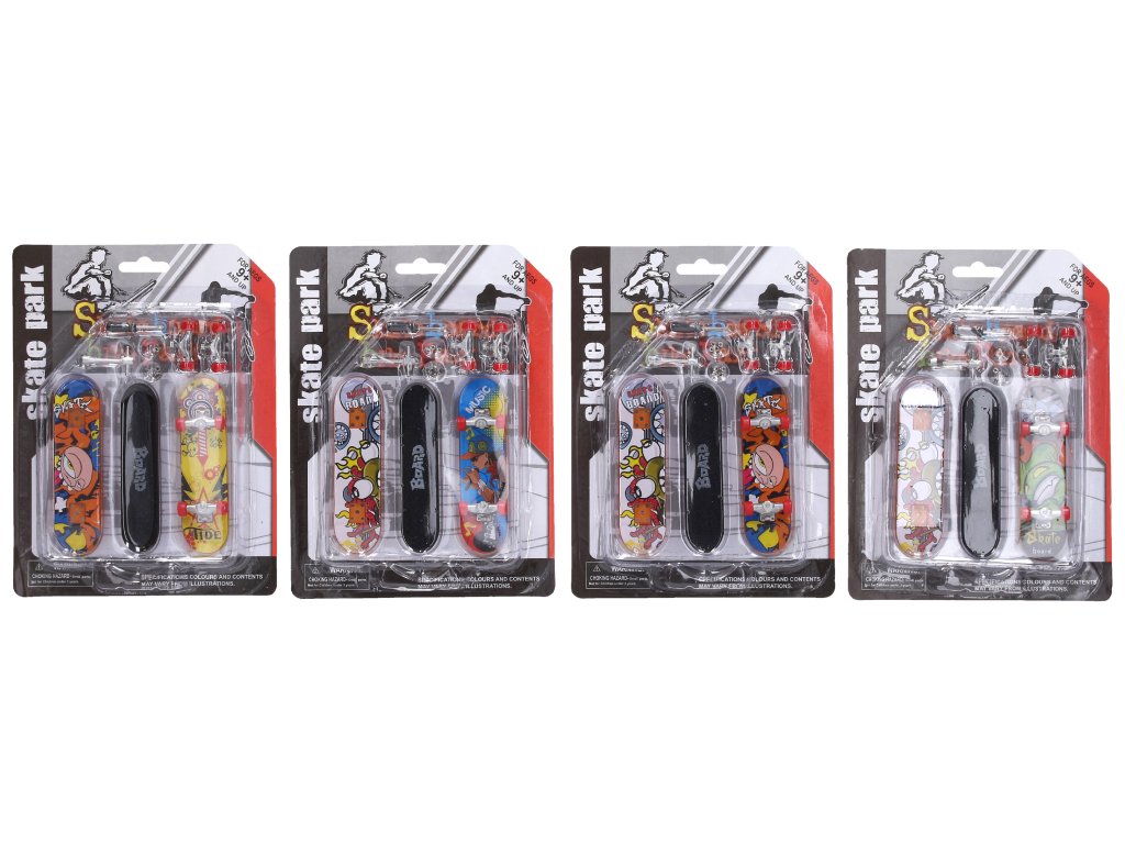 Fingerboard sada s náhradními díly. Délka prkna 9,5 cm. Obsah balení - 1xkompletní fingerboard, 2 náhradní trucky, 8 náhradní šroubků, náhradní prkno, náhradní grip tape, sada šroubováčků na montáž. Více variant.