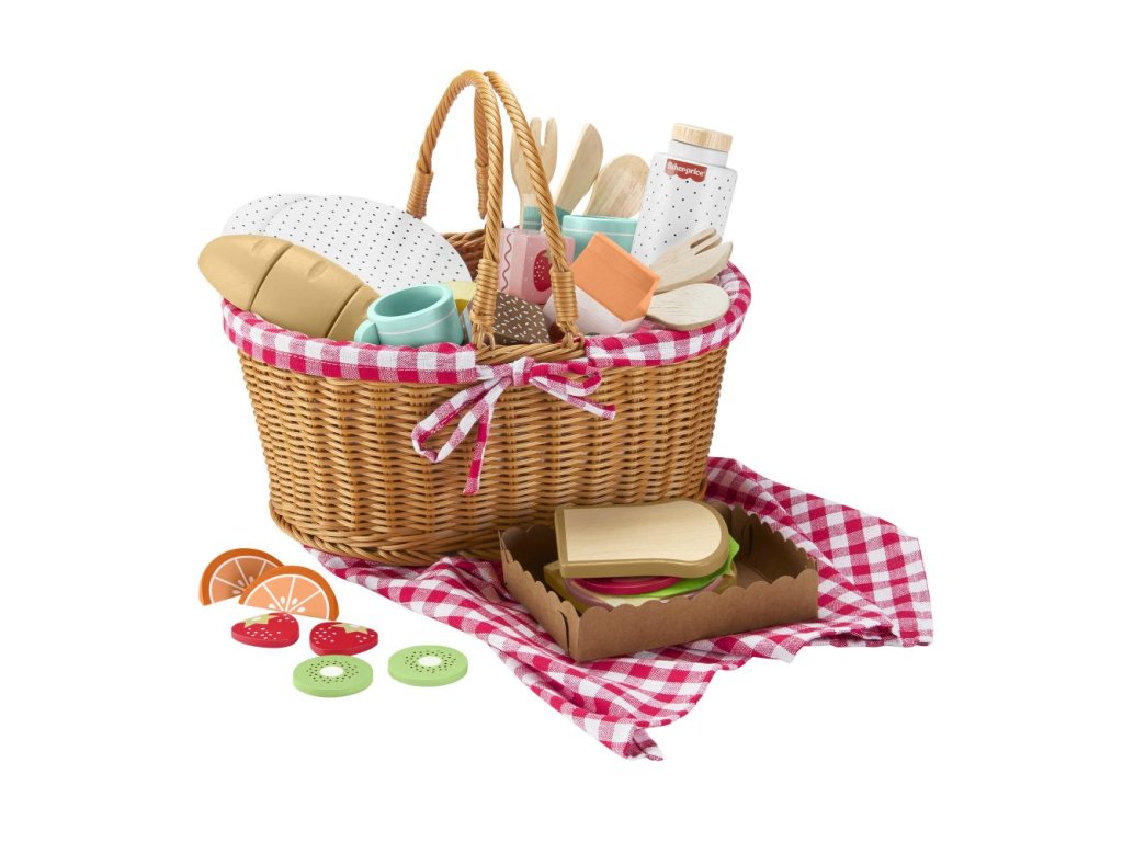 S piknikovým košem a setem na hraní s dřevěným "jídlem" od Fisher-Price® mohou předškolní děti vyrazit na nekonečná venkovní dobrodružství. Tato 31dílná sada obsahuje vše, co děti potřebují pro zábavný piknik, včetně talířů, hrníčků, příborů, 17 hravých potravin, příjemné kostkované deky a košíku na přenášení veškerého jídla a vybavení. Díly jsou vyrobené ze dřeva z dobře obhospodařovaných lesů s certifikací FSC®. (FSC C004225, 2019)