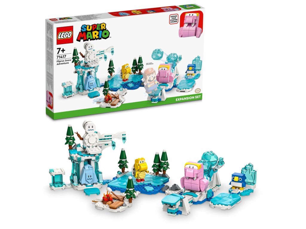 Děti mohou svůj svět LEGO® Super Mario™ obohatit o vzrušující ledovou úroveň se stavebnicí Sněhové dobrodružství s Fliprusem – rozšiřující set (71417), která nabízí 4 postavy ze hry Super Mario™. Hráči mohou sbírat digitální mince za to, že figurkám LEGO® Mario™, LEGO® Luigi™ nebo LEGO® Peach™ (nejsou součástí balení) pomohou porazit Červeného Koopa Troopu, Freezieho a Flipruse. Také mohou bruslit na „ledě“, zahřát se u „ohně“ a dát skryté ovoce jako dárek malému tučňáčkovi. (Poznámka: Ke hraní je zapotřebí startovací set 71360, 71387 nebo 71403.)