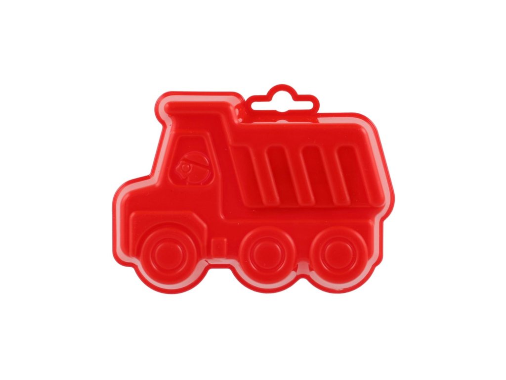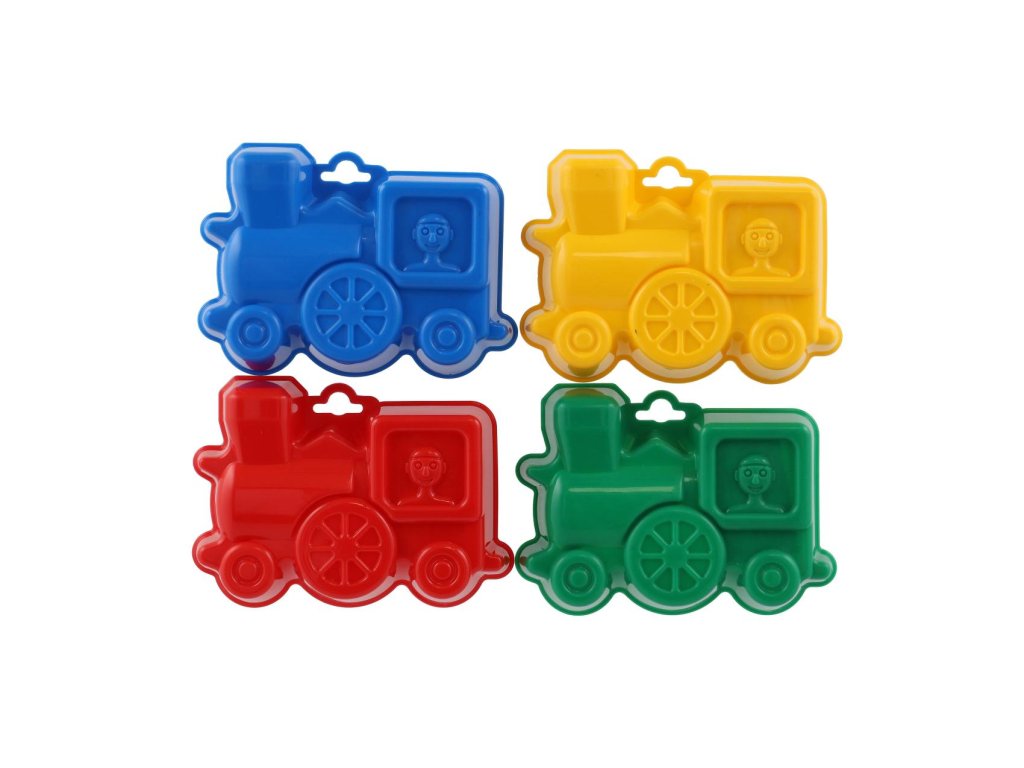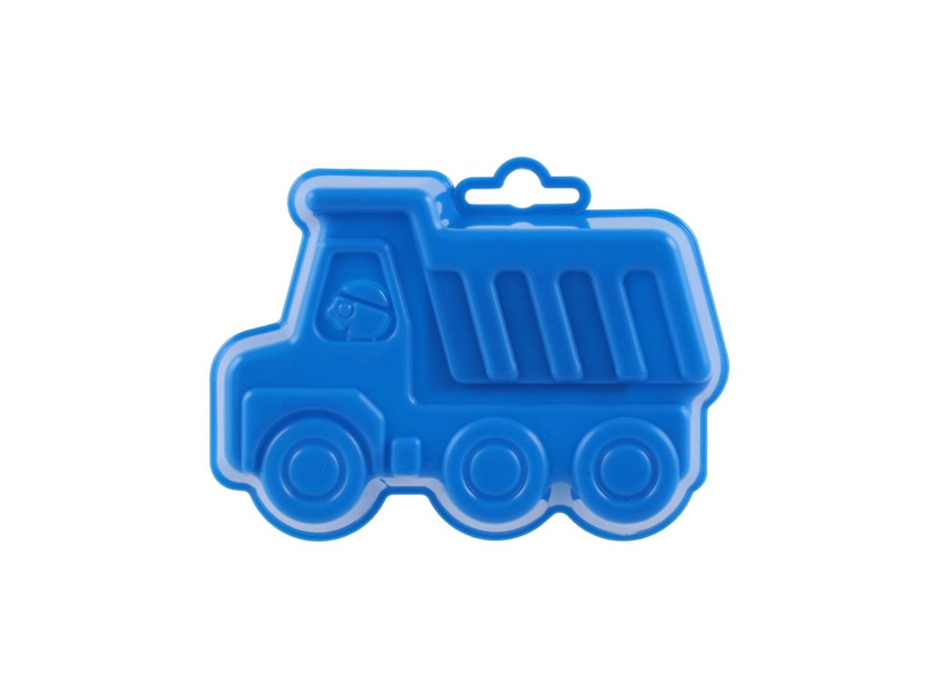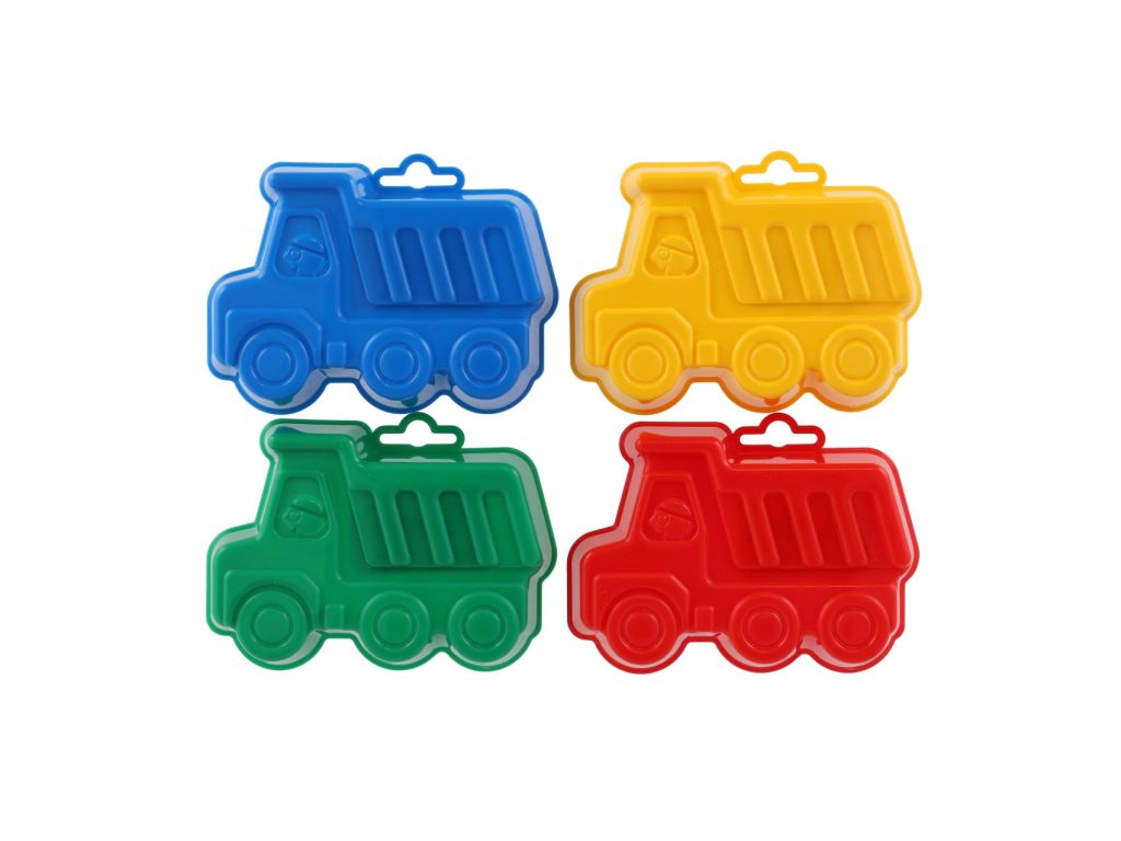 Plastové bábovky na písek ve tvaru dopravních prostředků.