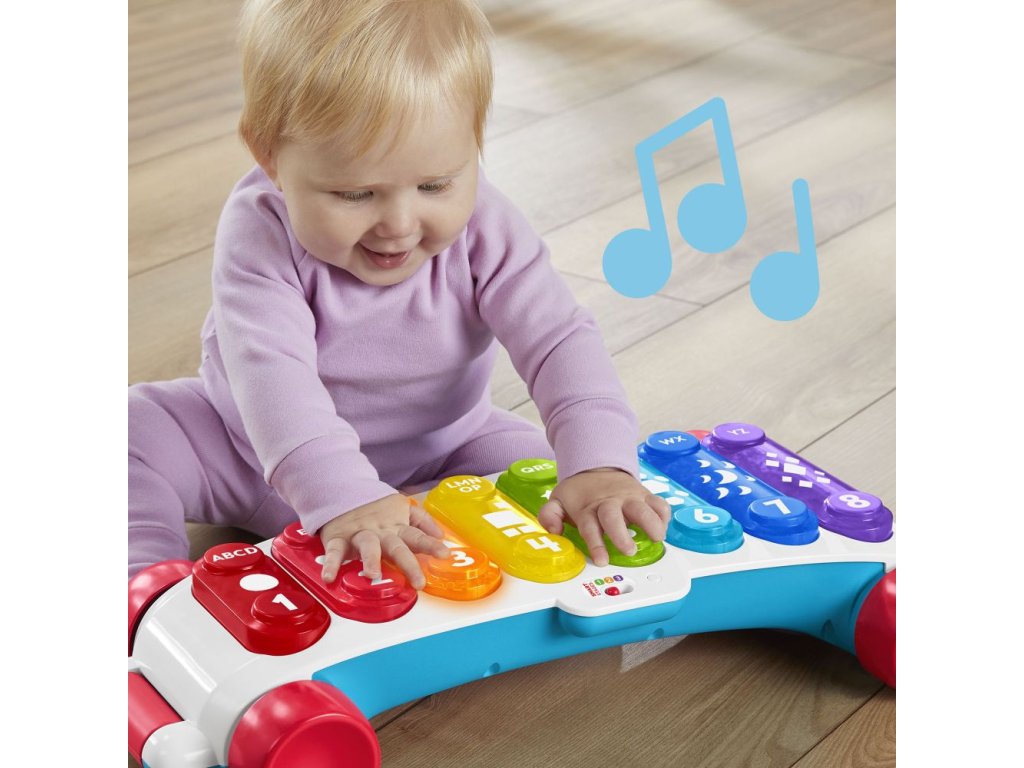 Ikonický klasický xylofon ve zvětšené velikosti od Fisher-Price® má dva režimy hry. Stisknutím 8 svítících tlačítek aktivují děti obsah, který učí abecedu, čísla, tvary a první slova. Protože se každé dítě vyvíjí jinak rychle, podporuje hračka technologii Smart Stages™, díky níž můžete zvolit takovou úroveň obsahu, která je pro vaše děťátko zrovna nejvhodnější. Vybrat můžete mezi třemi úrovněmi výukového obsahu. Druhý režim hry nabízí dětem zábavnou hru na tahání, kdy děti mohou táhnout xylofon za sebou za rukojeť. Rukojeť se dá sklopit pod hračku pro pohodlnou hru v sedě.