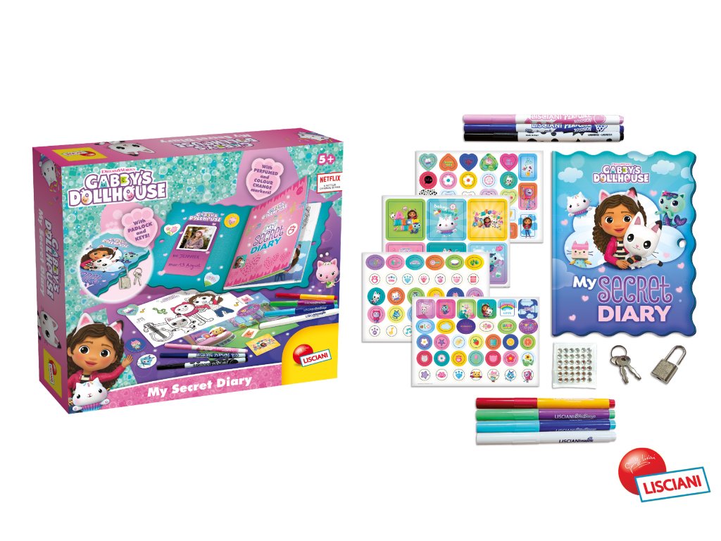 Gábinin kouzelný domek Tajný deníček. Tajný deníček na zámek, s dekoracemi a kreslícími potřebami. Obsah balení - deníček, zámek a klíč, samolepky, barevné fixy s vůní, pera měnící barvu, dekorativní kamínky, návod.