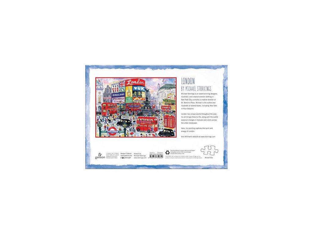Oceněný ilustrátor Michael Storrings ve svém umění zachycuje zvláštní podstatu měst. Puzzle s detailní ilustraci Londýna s 1000 dílky oživuje ruch Piccadilly Circus. Puzzle jsou zabalené v pevné krabici.  Hlavní vlastnosti: obsahuje 1000 dílkůpotištěno netoxickými inkoustyprémiová kvalita puzzlejednotlivé dílky do sebe přesně pasujírozvíjí logické myšlení a motoriku