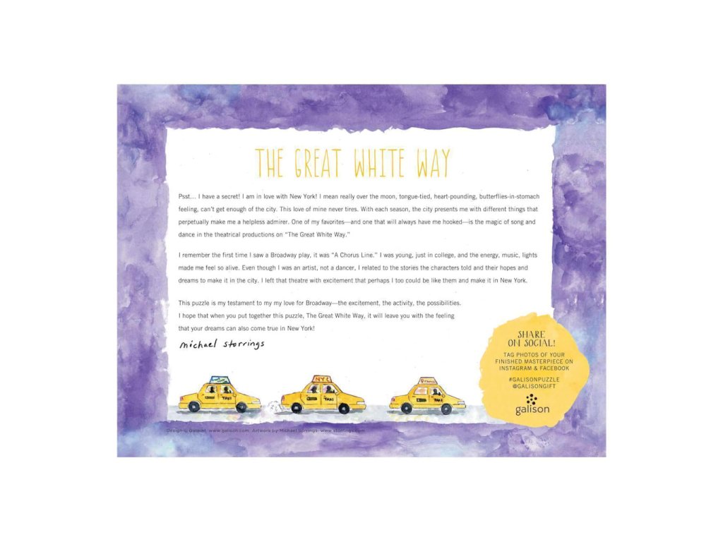 Oceněný designér, ilustrátor a kreativní ředitel Michael Storrings zachycuje kouzlo Broadwaye a divadelní čtvrti New Yorku. 2000dílné puzzle Světla na Broadwayi je zabaleno ve stylové robustní krabici s matným povrchem, ideální jako dárek. Hlavní vlastnosti: obsahuje 2000 dílkůilustrace Michael Storringsjednotlivé dílky do sebe přesně pasujírozvíjí logické myšlení a motorikuskvělý design