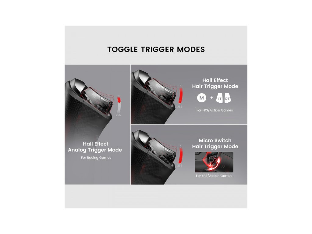 Analogové spouště s Hallovým efektem: Nabízejí bezkonkurenční plynulost a odezvu. Možnost rychlého přepnutí do režimu Hair Trigger pro FPS a akční hry.